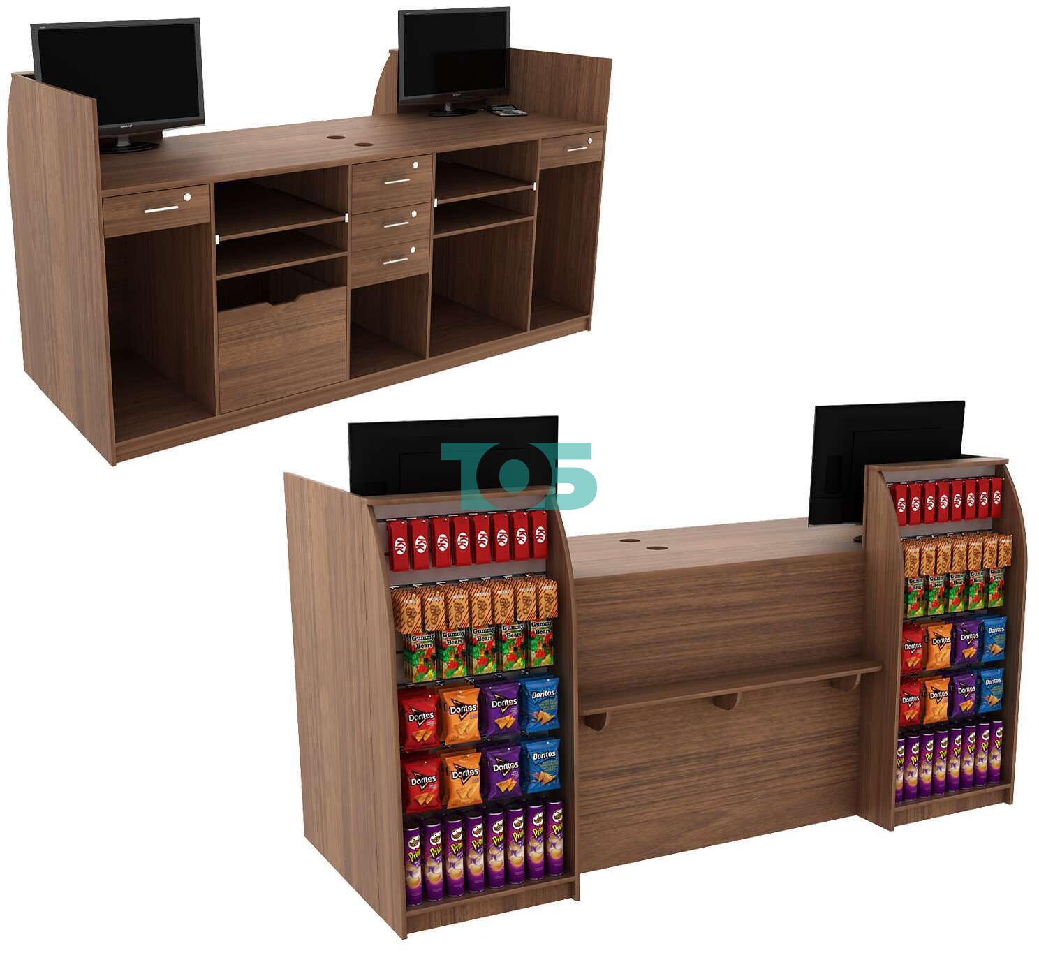 Ресепшен Атлант с фасадными наклонными полочками и экономпанелью №5 представляет собой современную и функциональную модель, разработанную с учетом многолетнего опыта нашей компании и пожеланий клиентов. Эта модель идеально подходит для магазинов одежды, обуви, косметики, парфюмерии, постельного белья и подарков, обеспечивая максимальную функциональность и удобство для двух продавцов.