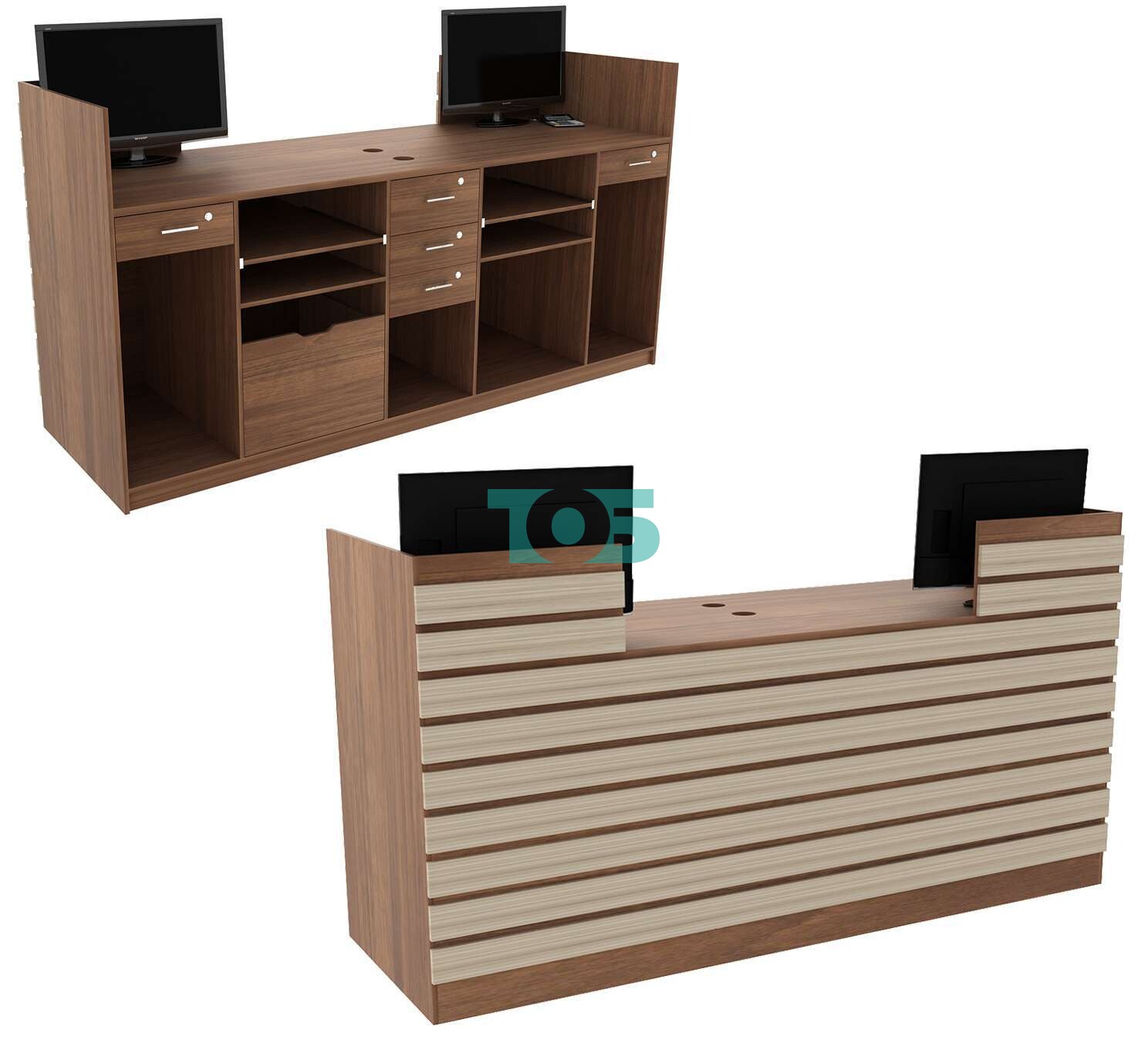 Правое и левое крыло ресепшена со стороны продавцов укомплектованы выдвижными ящиками с врезными замками и секциями под компьютерные блоки.