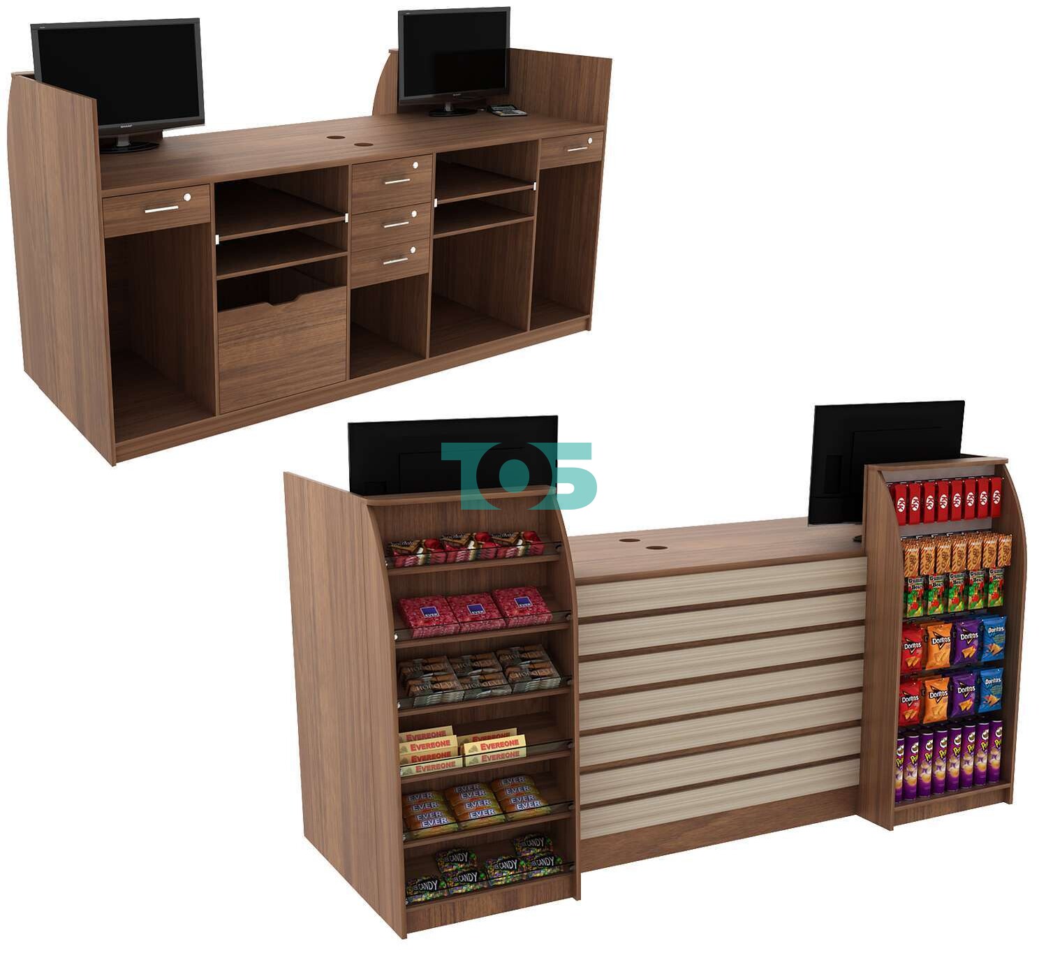 Правое и левое крыло со стороны продавцов укомплектованы выдвижными ящиками с врезными замками и секциями под компьютерные блоки.
