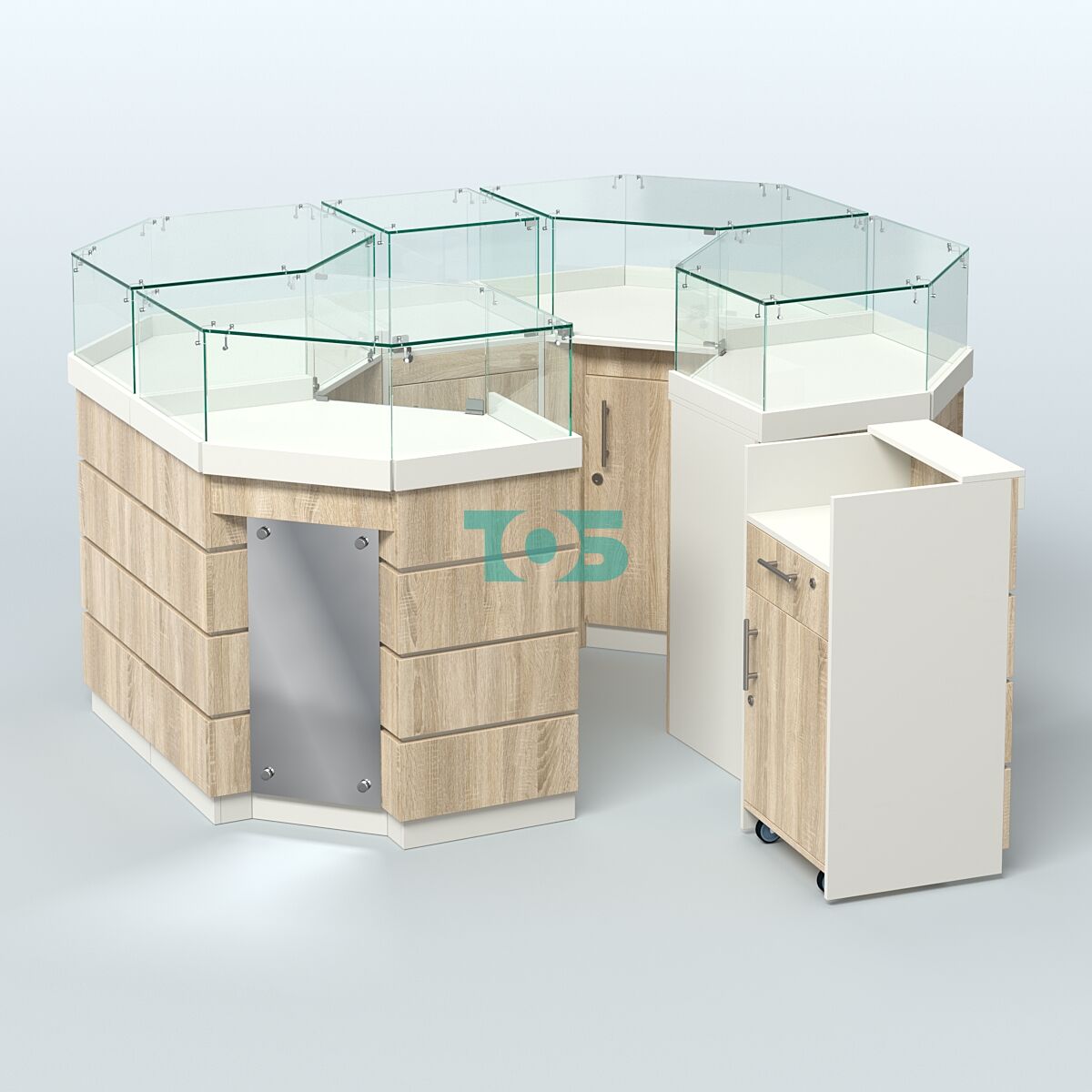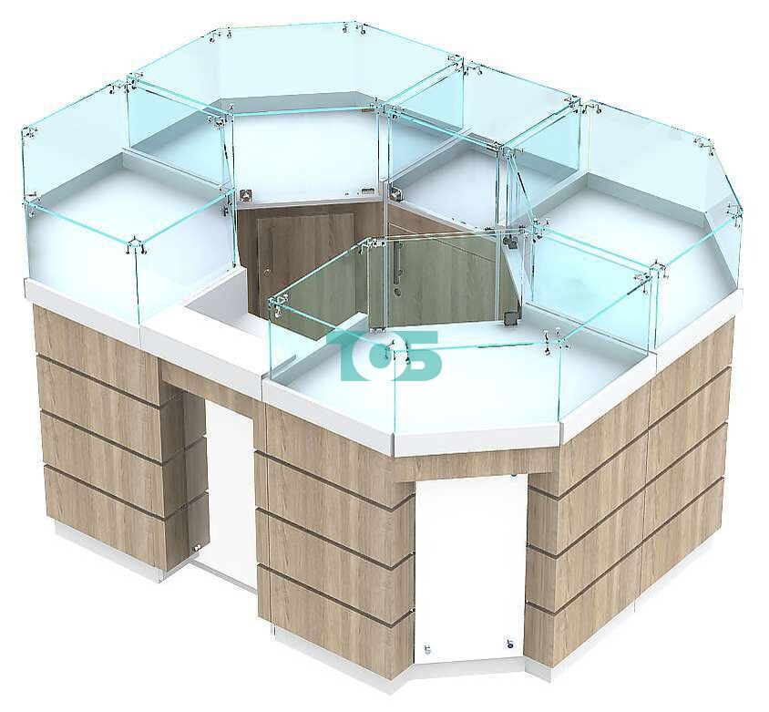 - островок включает четыре угловых модуля, один узкий модуль шириной 450 мм и один прилавок под кассу на металлических колесах, выполняющий функцию входной зоны;