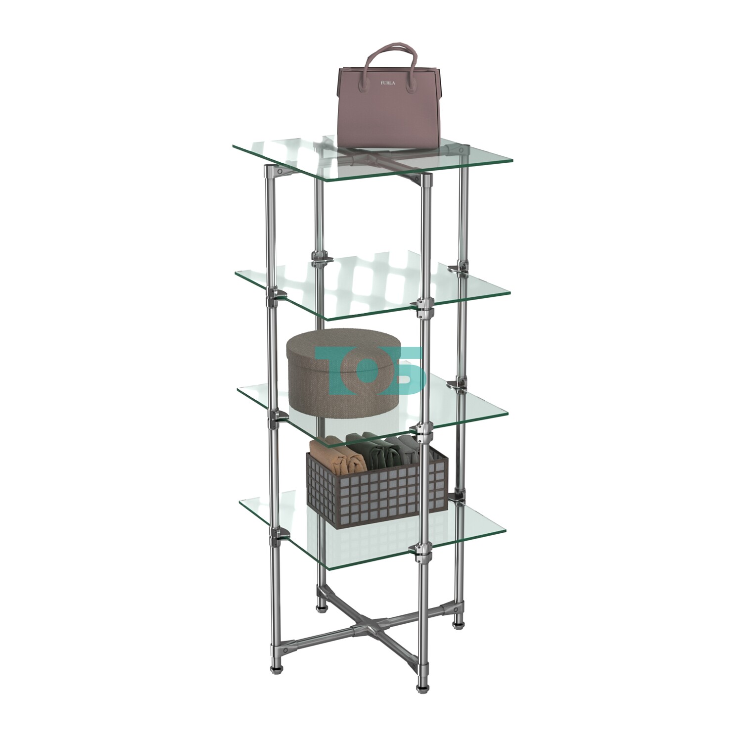 Четыре прозрачные полки из стекла толщиной 8 мм: Прочные и безопасные, идеально подходят для демонстрации товаров.