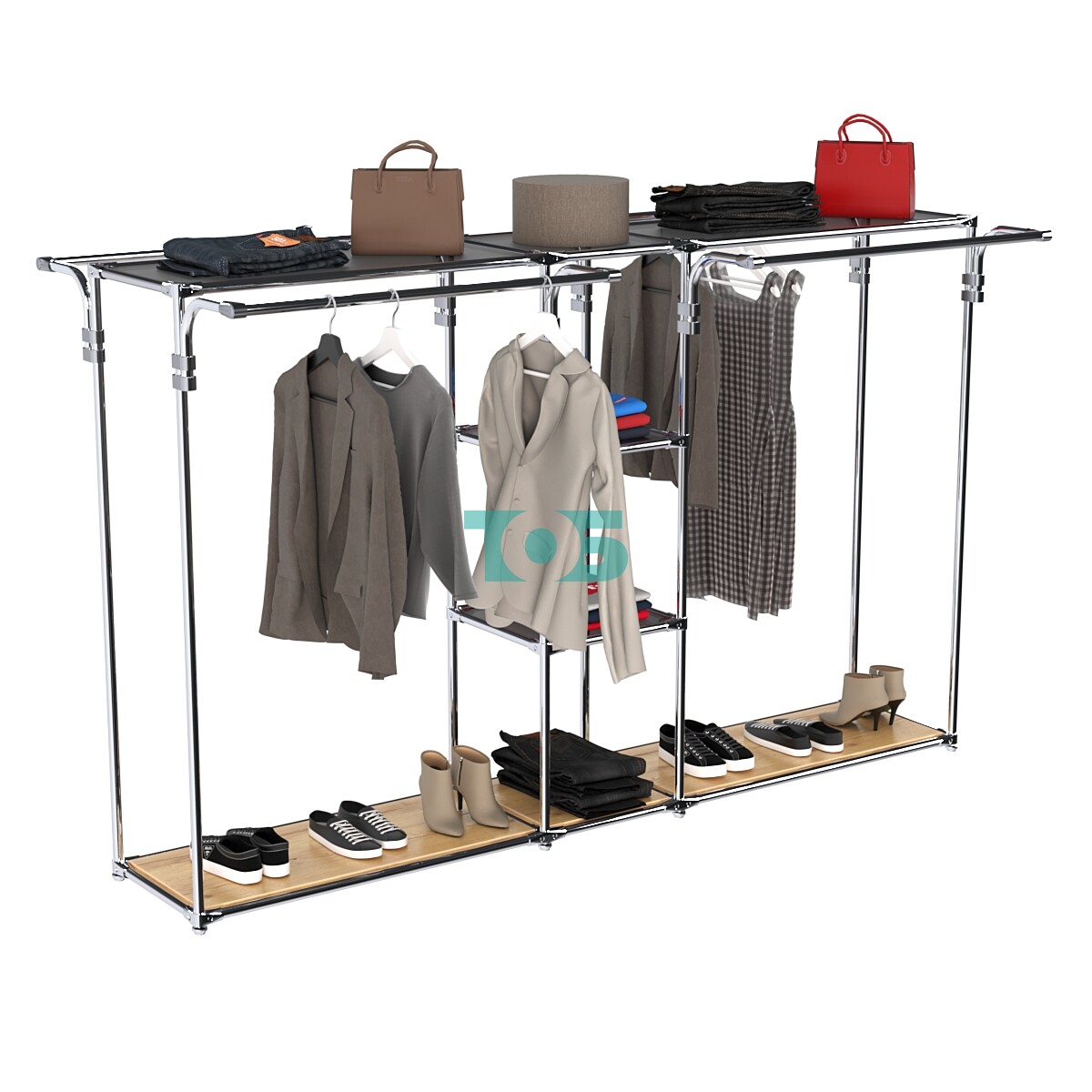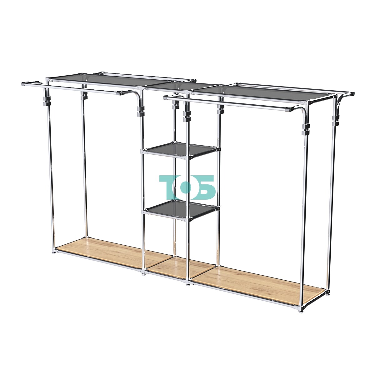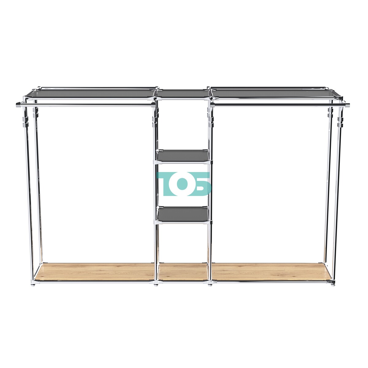 В правой и левой части стенда расположены отсеки с выносными поручнями, которые идеально подходят для тяжелой и крупногабаритной одежды. Поручни можно регулировать по высоте, что делает стенд универсальным для различных типов товаров.