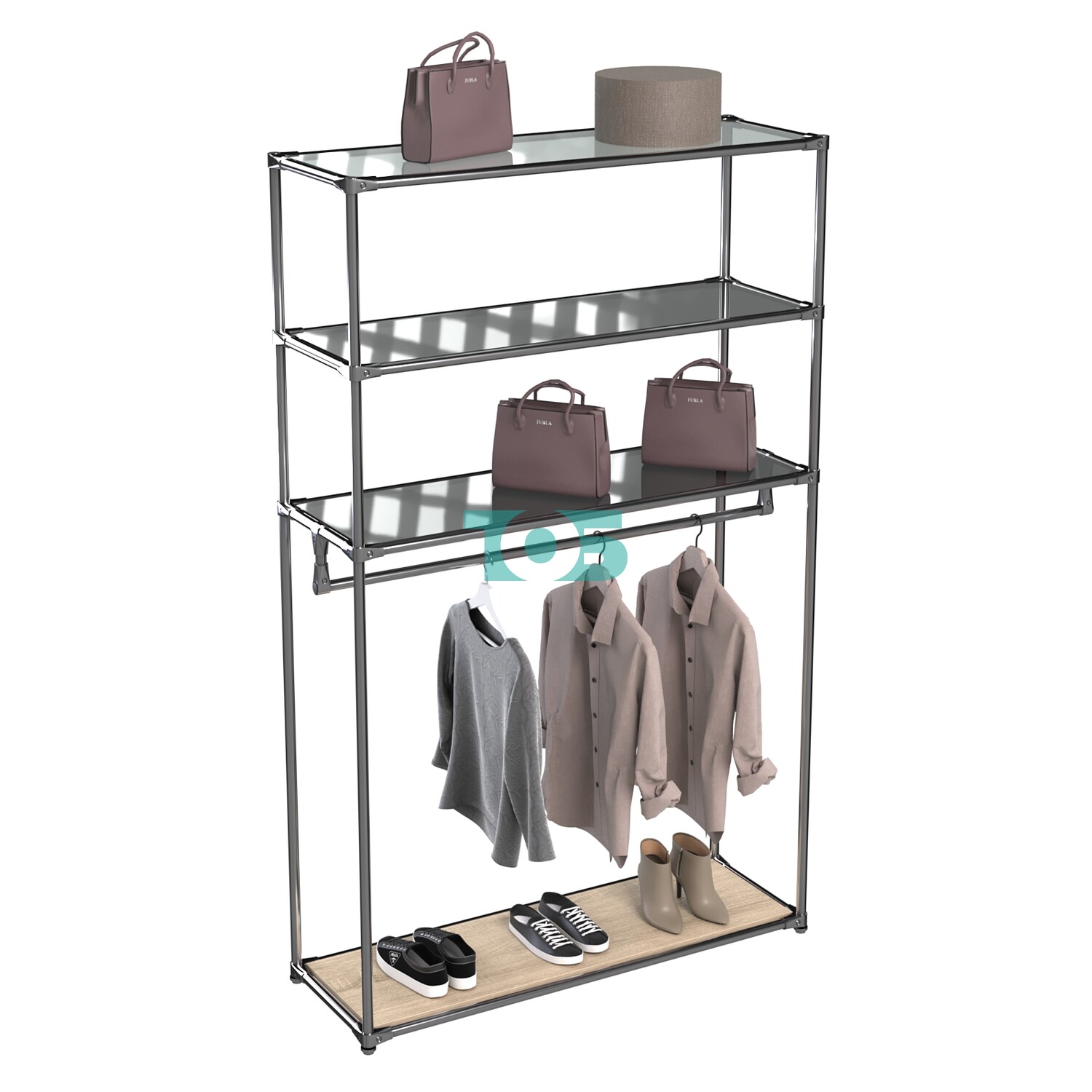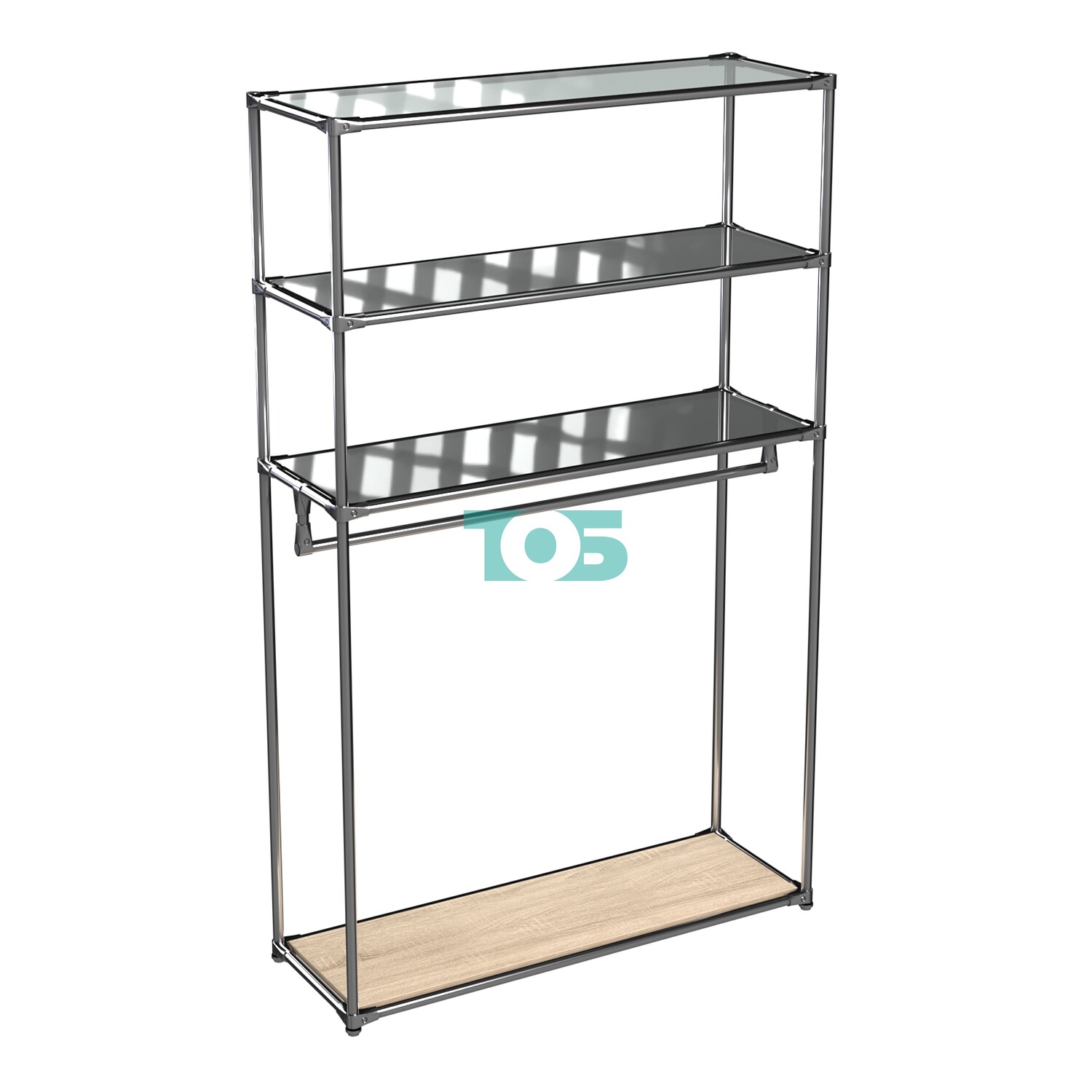 Один внутренний поручень: Предназначен для демонстрации одежды, регулируется по высоте, что позволяет оптимально использовать пространство для размещения различных видов одежды.