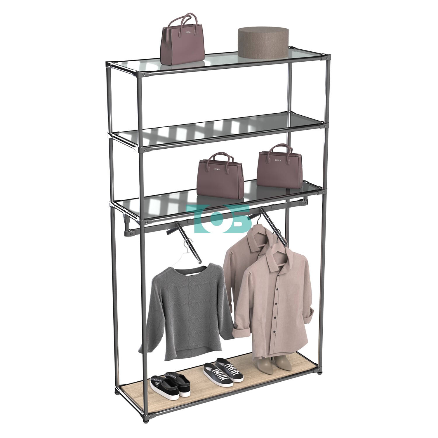 Один внутренний поручень под выносные кронштейны для одежды с фасадной вывеской: Позволяет демонстрировать одежду с использованием крючков или кронштейнов, которые приобретаются отдельно в зависимости от моделей и их размерного ряда. Это дает возможность гибко подходить к выкладке товара.