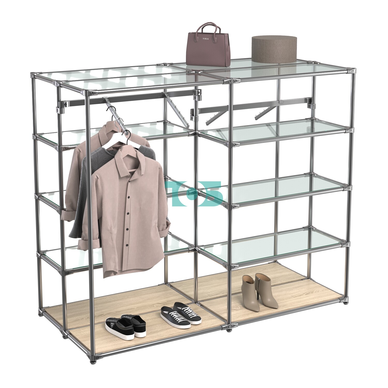 Шесть стеклянных полок 6 мм в хромированной обвязке: Придают конструкции легкость и элегантность, а также позволяют размещать дополнительные товары, такие как аксессуары или небольшие предметы одежды.