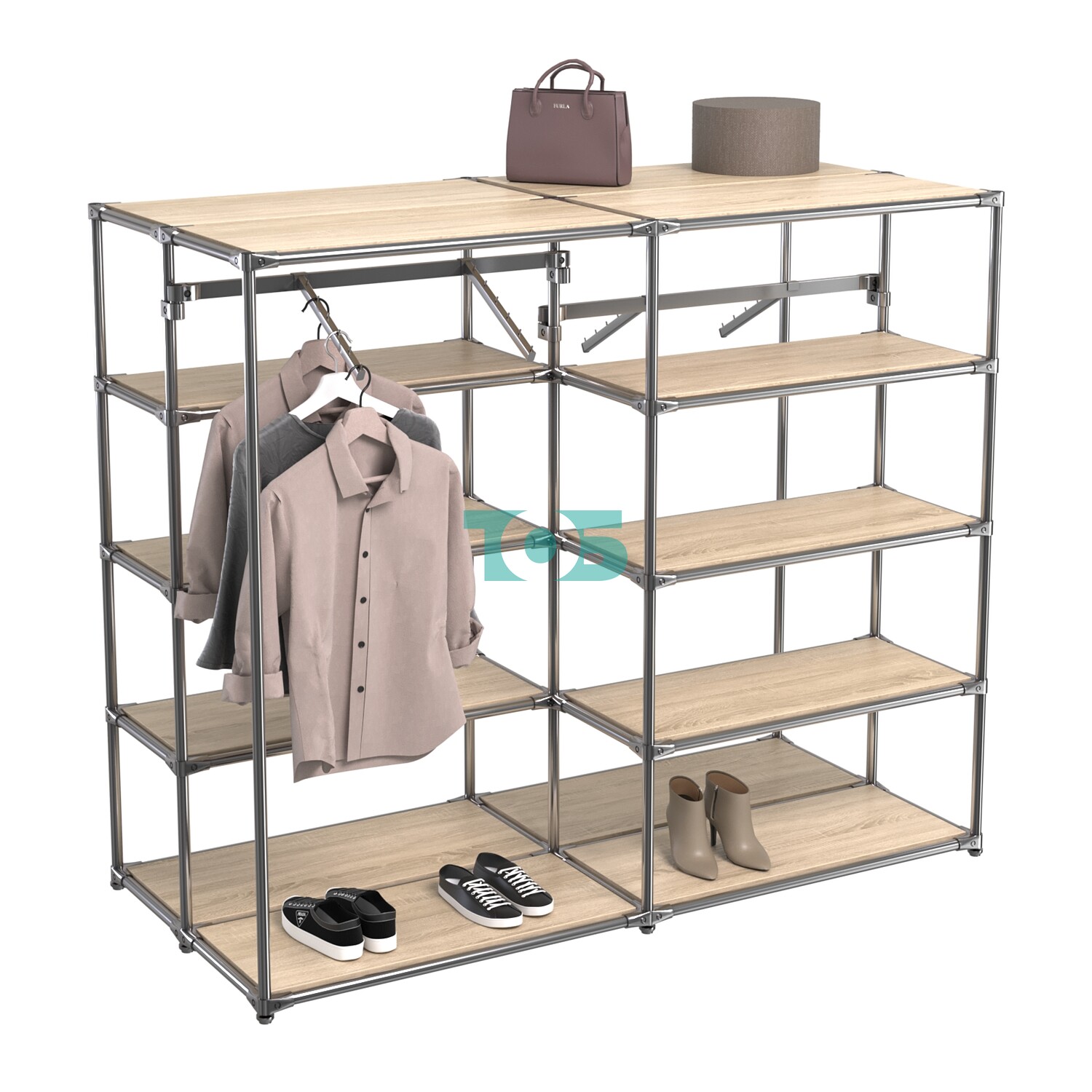 Шесть полок из ДСП 16 мм в хромированной обвязке: Придают конструкции прочность и стабильность, позволяя размещать дополнительные товары, такие как аксессуары или небольшие предметы одежды.