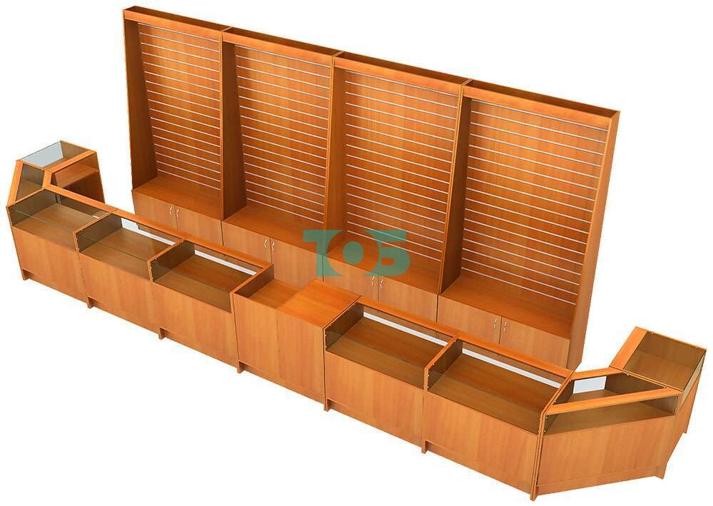 Стеллажи: за спиной продавца стоят стеллажи с экономпанелью высотой 2400 мм, что позволяет эффективно использовать вертикальное пространство для размещения товаров.
