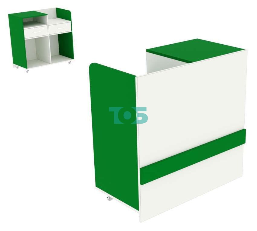 Прилавок изготавливается из современных и качественных материалов, также способен максимально выгодно представить ассортимент аптечного товара. Прилавок используется как кассовый модуль первой линии в торговом зале аптеки;