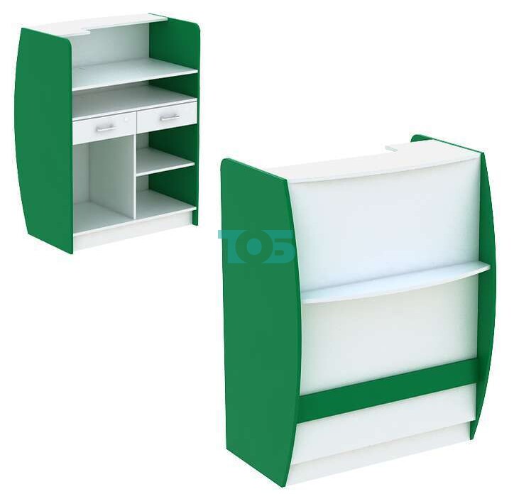 Прилавок изготавливается из современных и качественных материалов, также способен максимально выгодно представить ассортимент аптечного товара. Прилавок используется как кассовый модуль первой линии в торговом зале аптеки;