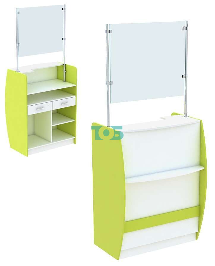 Прилавок изготавливается из современных и качественных материалов, также способен максимально выгодно представить ассортимент аптечного товара. Прилавок используется как кассовый модуль первой линии в торговом зале аптеки;