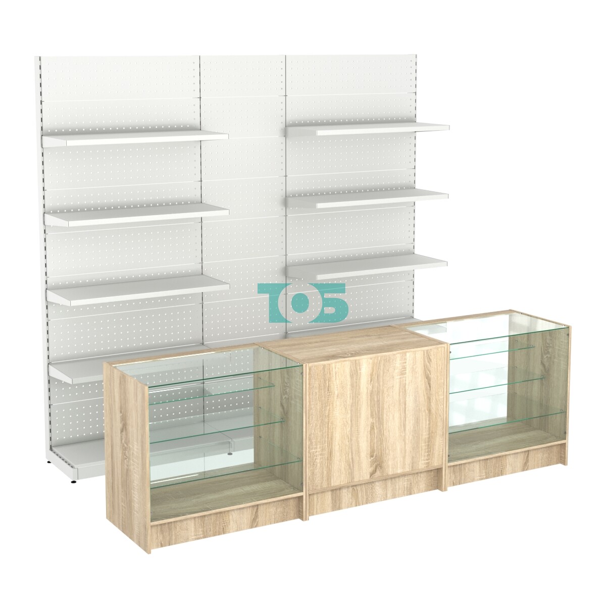 Комплект металлических стеллажей с полками и перфорацией и прилавков ЭК-4