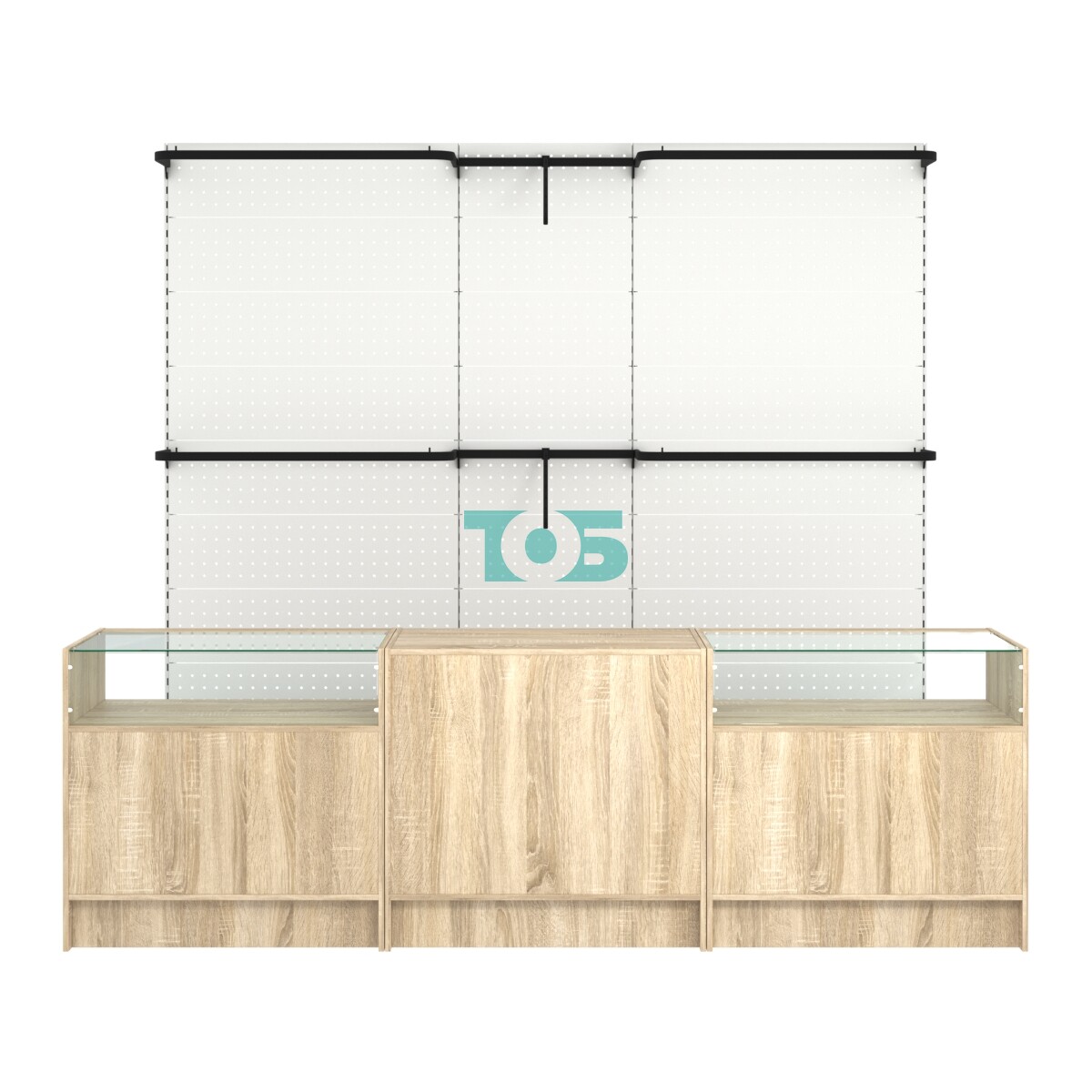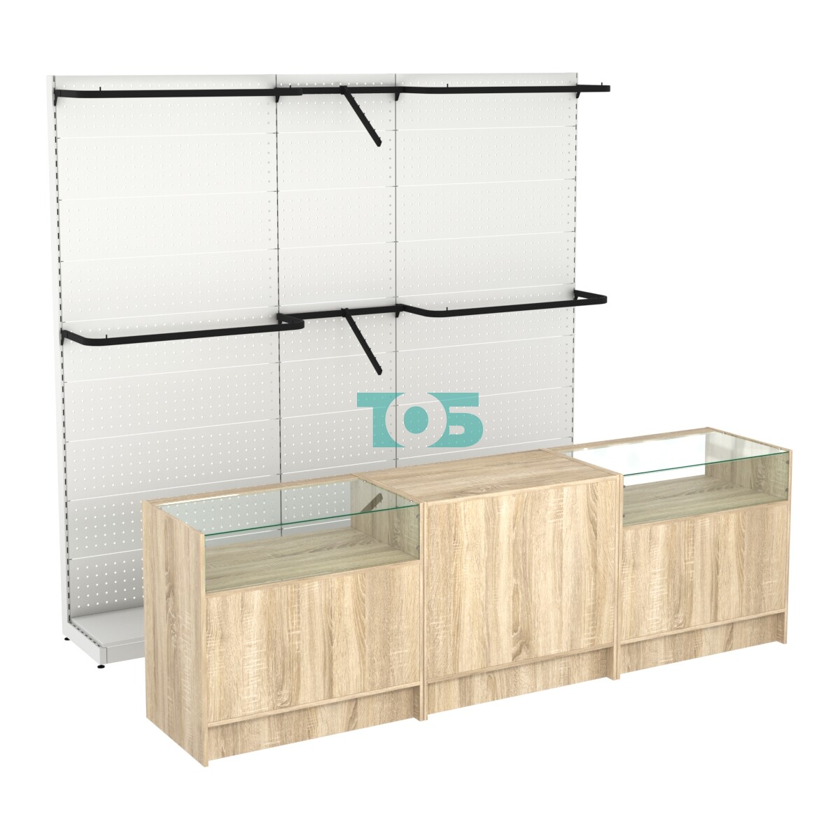 - ширина комплекта 2700мм указана по габариту внешних прилавков, стеллажи на второй линии шириной 2600мм;