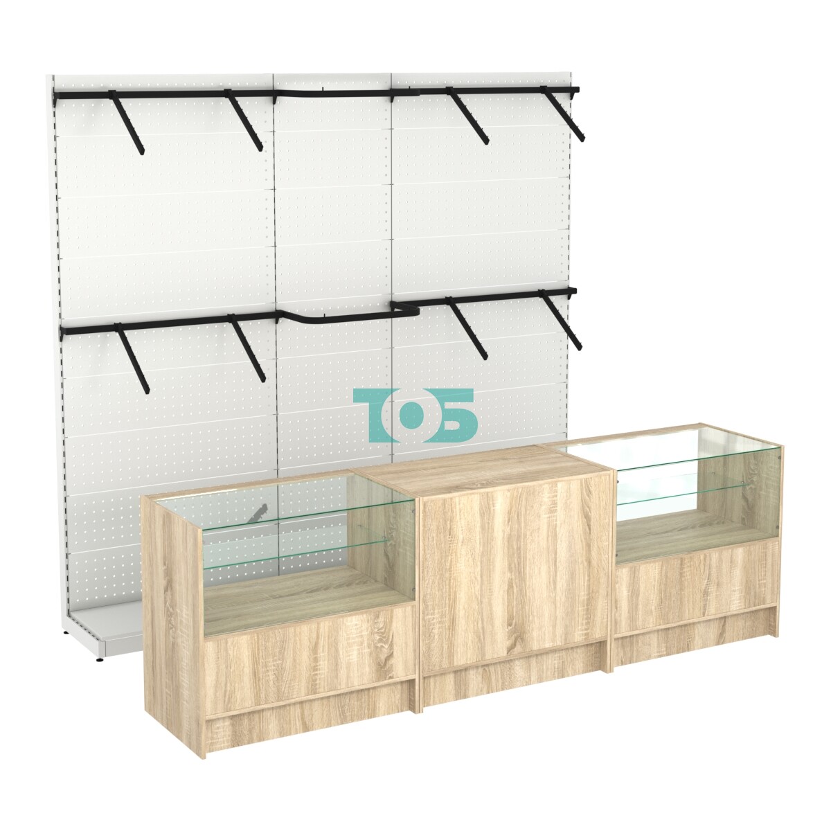 - ширина комплекта 2700мм указана по габариту внешних прилавков, стеллажи на второй линии шириной 2600мм;