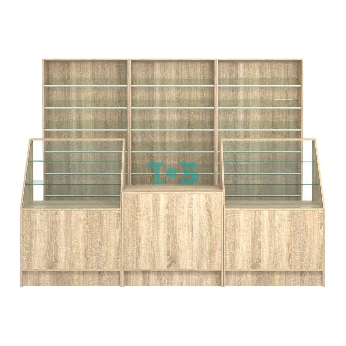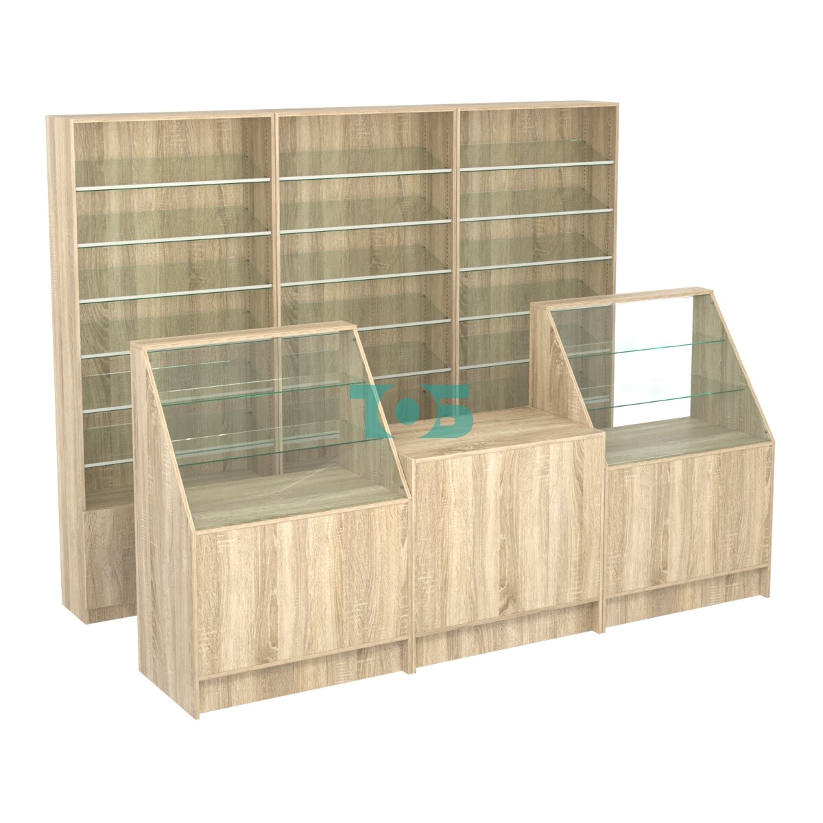 Комплект стеллажей с наклонными стеклянными полками SL-6 №12 и прилавков ЭК-07