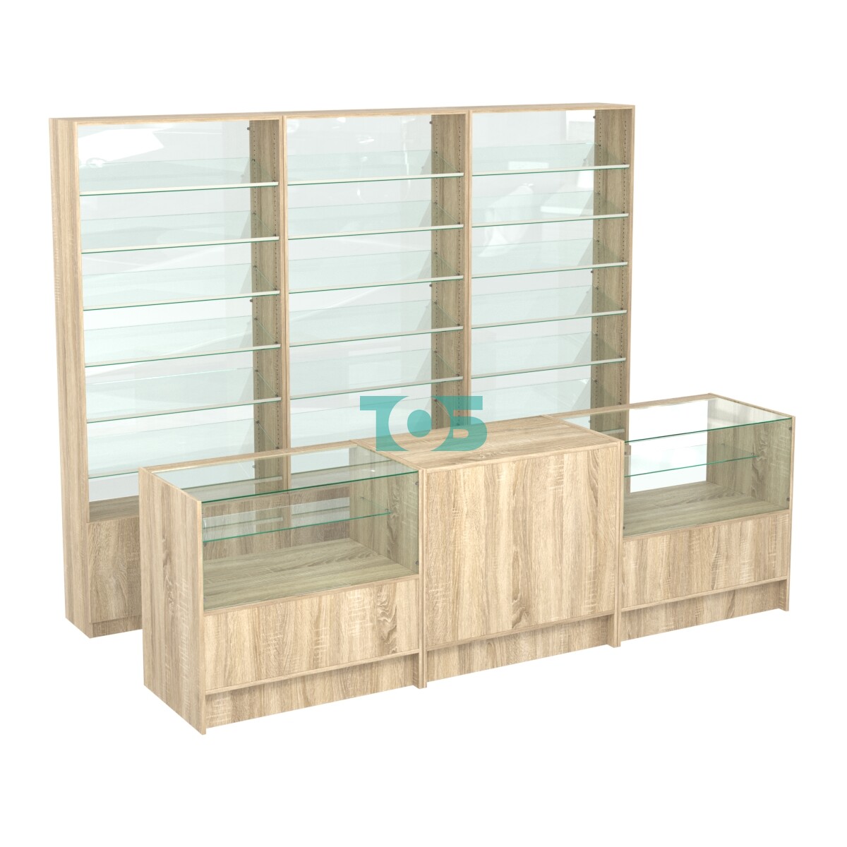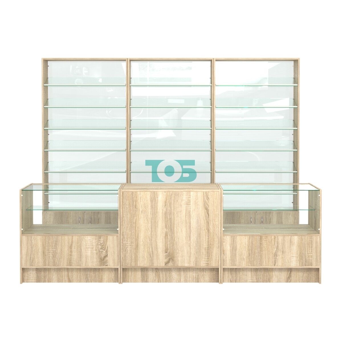 Комплект стеллажей с наклонными стеклянными полками SL-6 №12-1 и прилавков ЭК-03
