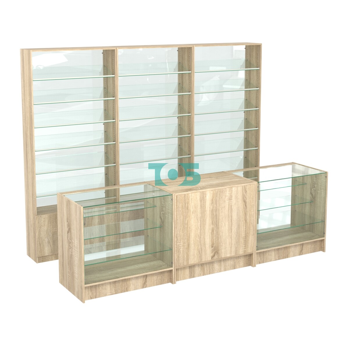 Комплект стеллажей с наклонными стеклянными полками SL-6 №12-1 и прилавков ЭК-04