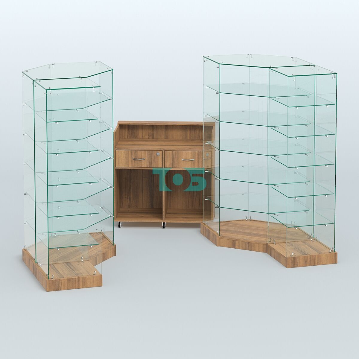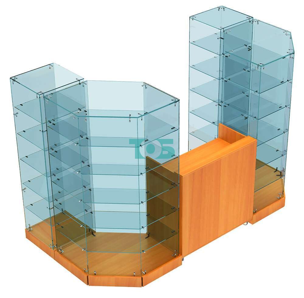 Полки: в павильоне предусмотрено по пять стеклянных полок на каждой стороне, расстояние между полками составляет 246 мм, что позволяет удобно разместить товары.