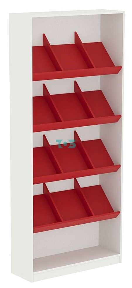 Отличия модели недорогого стеллажа с наклонными разделителями для аптеки RED-СЭ-3-300: