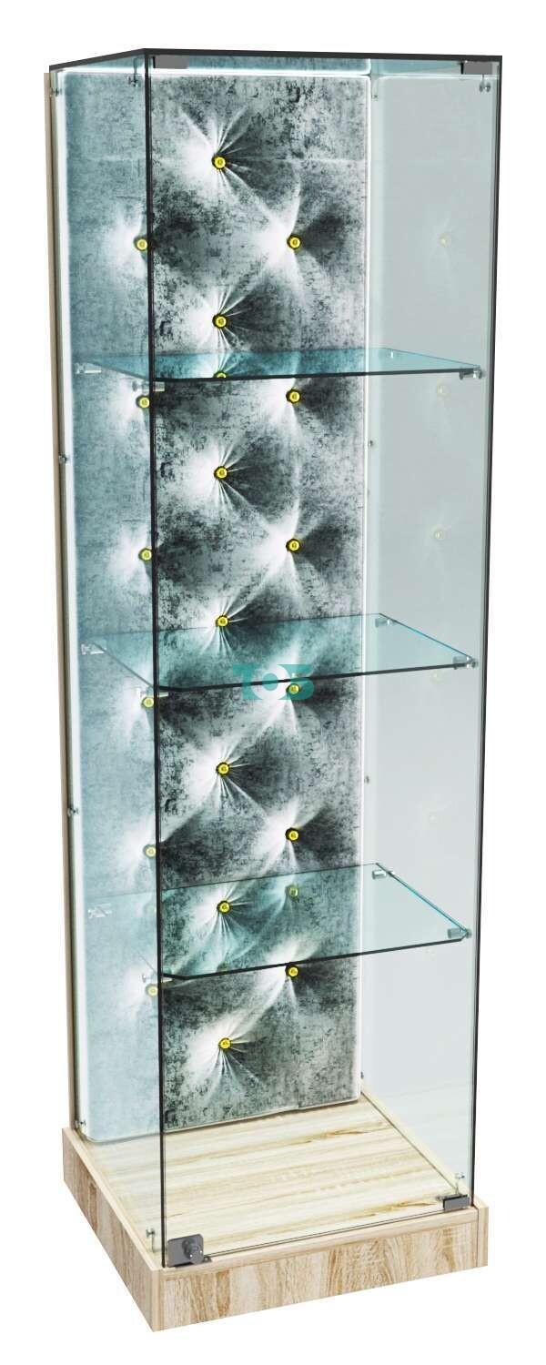 - задняя стенка витрины декорирована обивкой из велюра БАРХАТ СЕРЫЙ ПЕРЛАМУТР, карета с золотыми втулками;