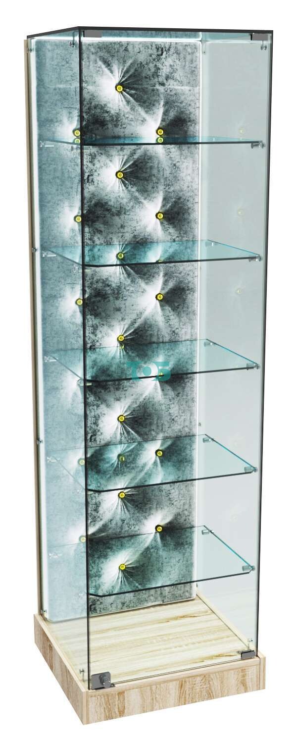 - задняя стенка витрины декорирована обивкой из велюра БАРХАТ СЕРЫЙ ПЕРЛАМУТР, карета с золотыми втулками;