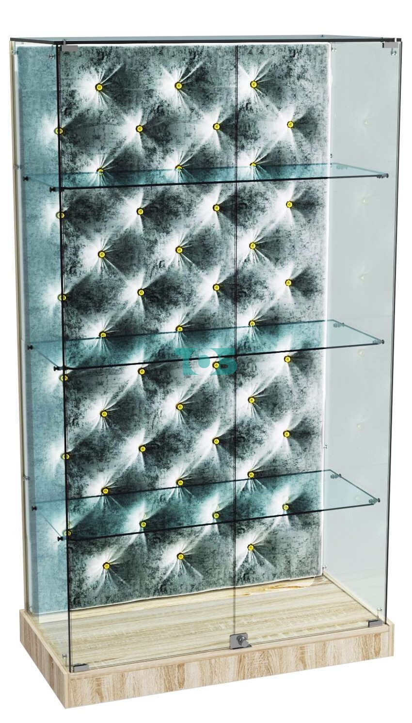 - задняя стенка витрины декорирована обивкой из велюра БАРХАТ СЕРЫЙ ПЕРЛАМУТР, карета с золотыми втулками;