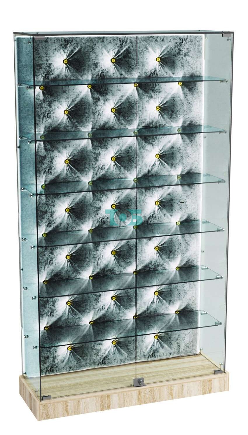 - задняя стенка витрины декорирована обивкой из велюра БАРХАТ СЕРЫЙ ПЕРЛАМУТР, карета с золотыми втулками;