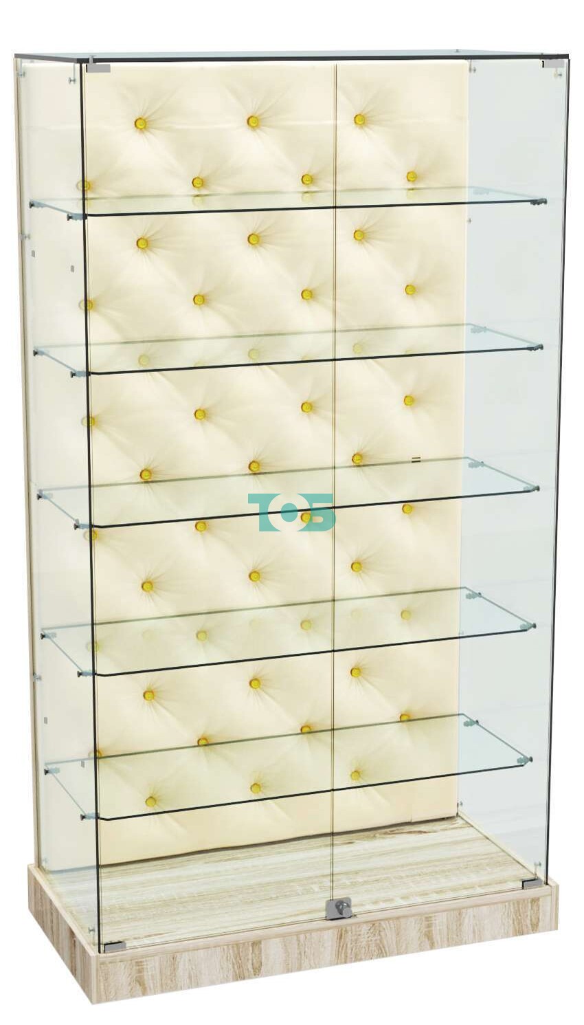 - задняя стенка витрины декорирована обивкой из велюра КРЕМОВЫЙ БАРХАТ, карета с золотыми втулками;