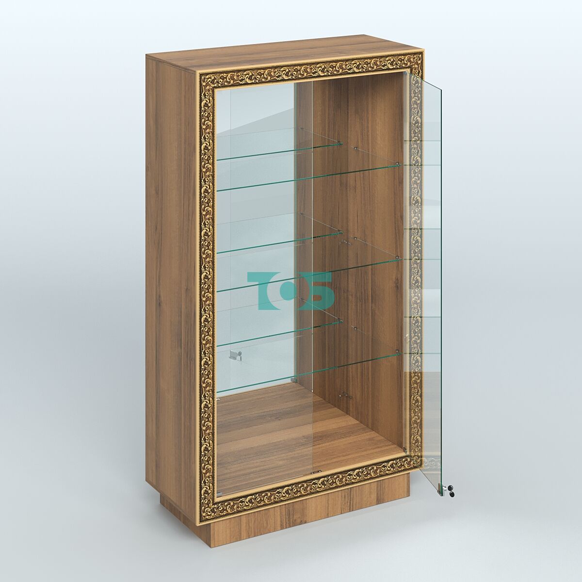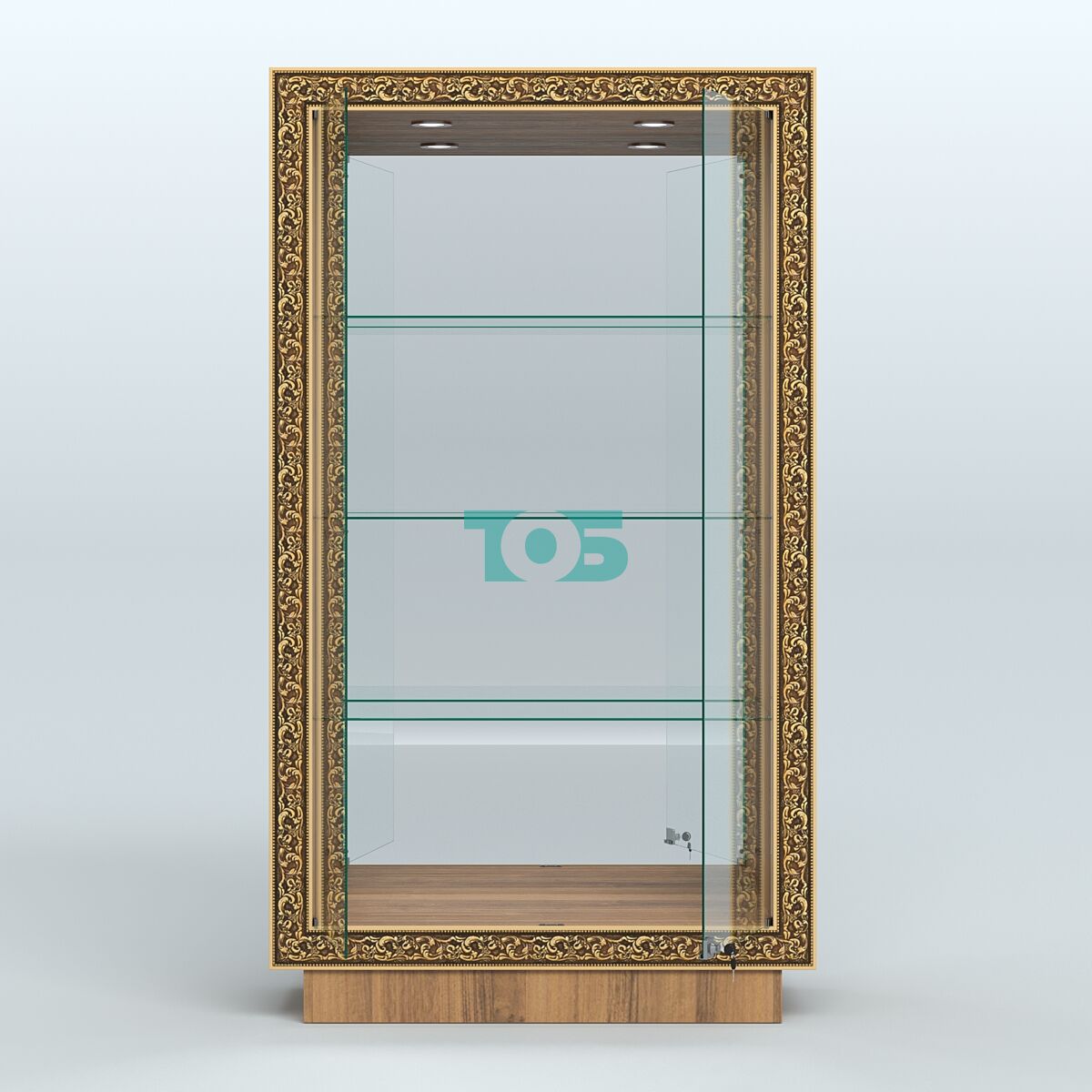 Фасадная часть: декорирована цветными молдингами под золото, которые подчёркивают чёткость линий и помогают вписать витрину в интерьер любого стиля.