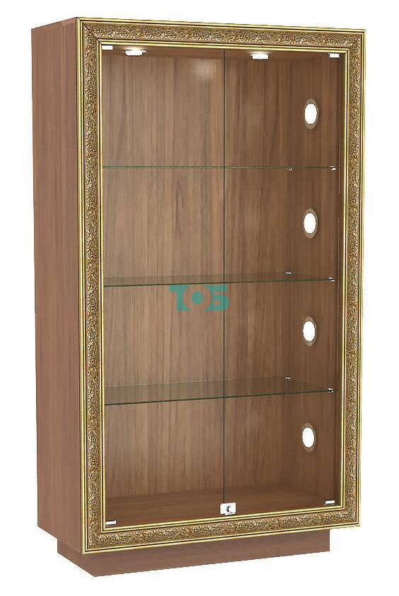 Фасадная часть: декорирована цветными молдингами под золото, которые подчёркивают чёткость линий и помогают вписать витрину в интерьер любого стиля.