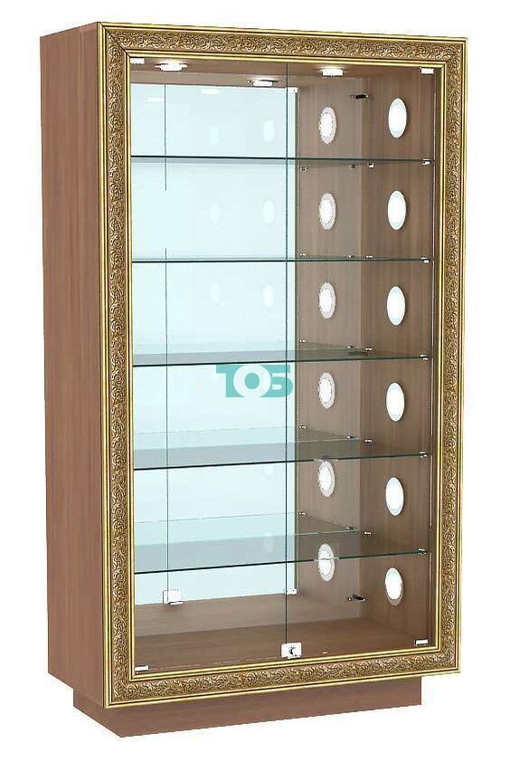 Фасадная часть: декорирована цветными молдингами под золото, которые подчёркивают чёткость линий и помогают вписать витрину в интерьер любого стиля.