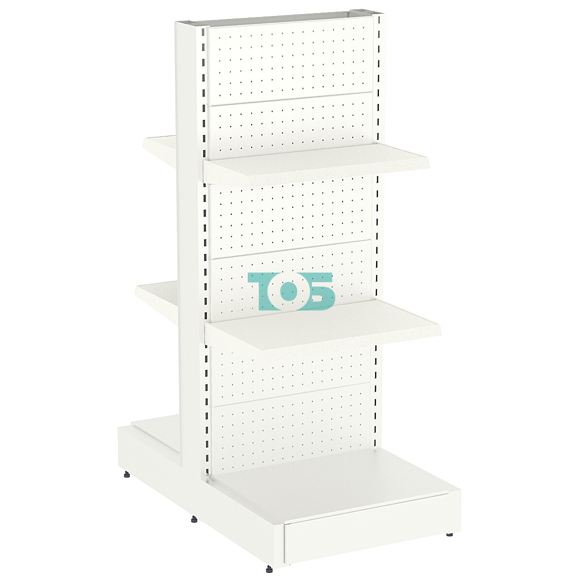 Тип стеллажа: островной. Полки расположены по обеим сторонам, что позволяет эффективно использовать пространство и обеспечивает удобный доступ к хранимым предметам с обеих сторон.