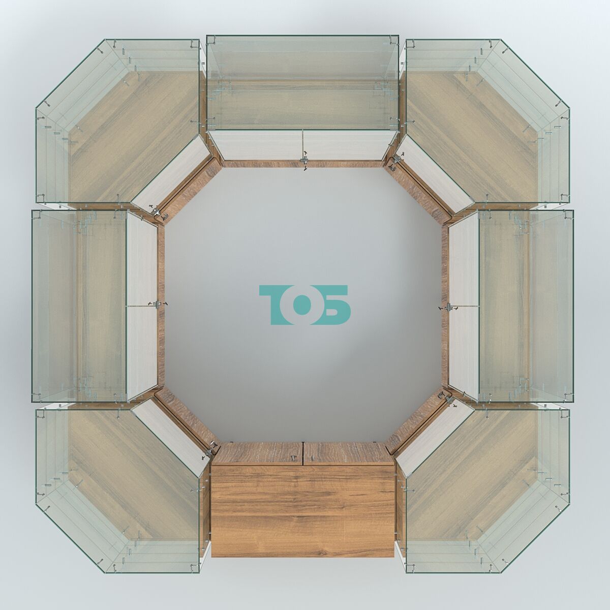 Габаритные размеры: могут быть изменены в зависимости от стандартных блоков витрин, что даёт возможность адаптировать павильон под конкретные условия и требования.