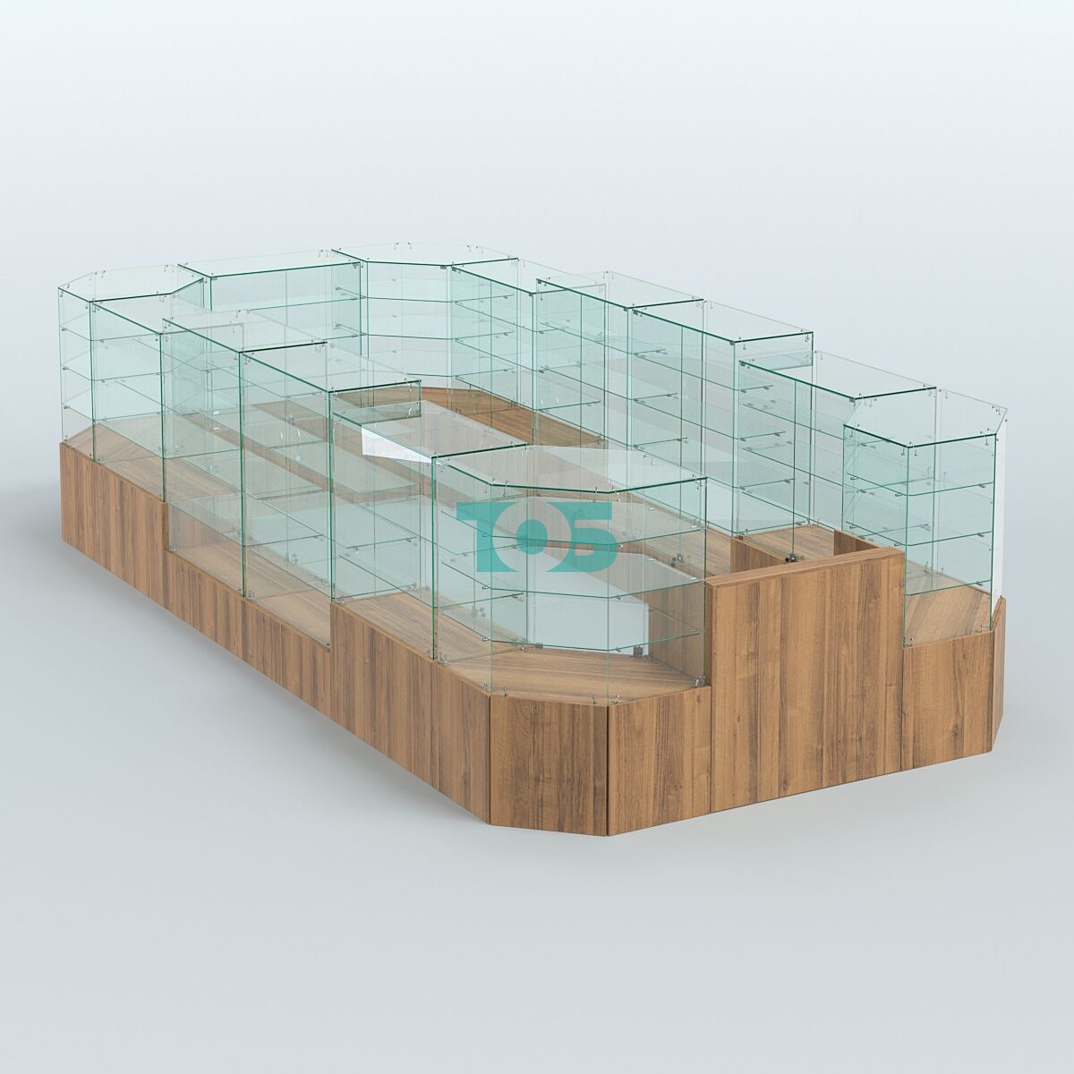 Габаритные размеры: могут быть изменены в зависимости от стандартных блоков витрин, что даёт возможность адаптировать павильон под конкретные условия и требования.