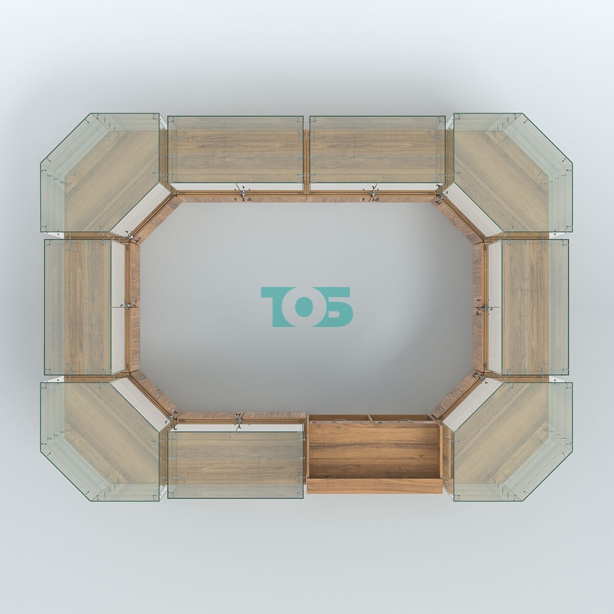 Габаритные размеры: могут быть изменены в зависимости от стандартных блоков витрин, что даёт возможность адаптировать павильон под конкретные условия и требования.