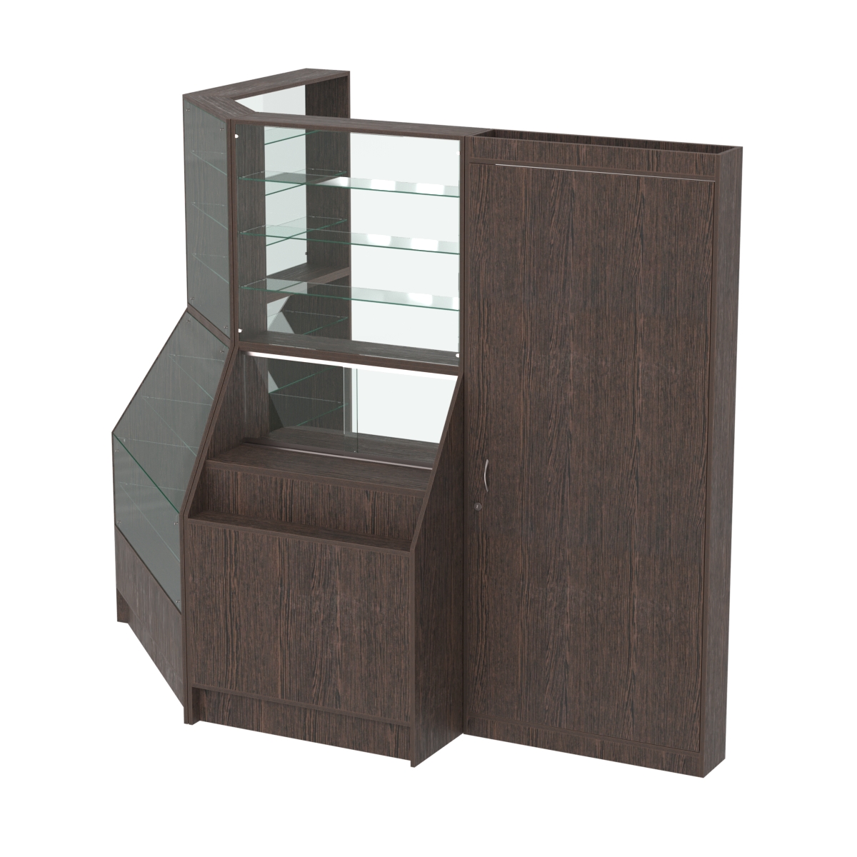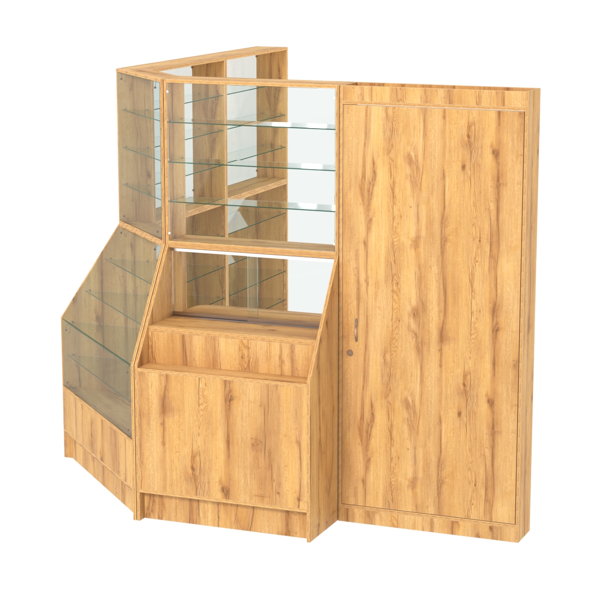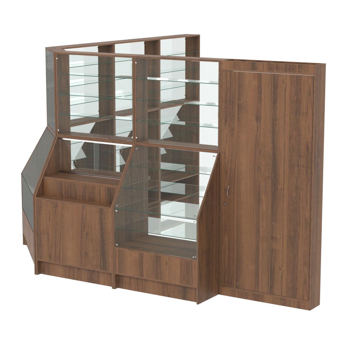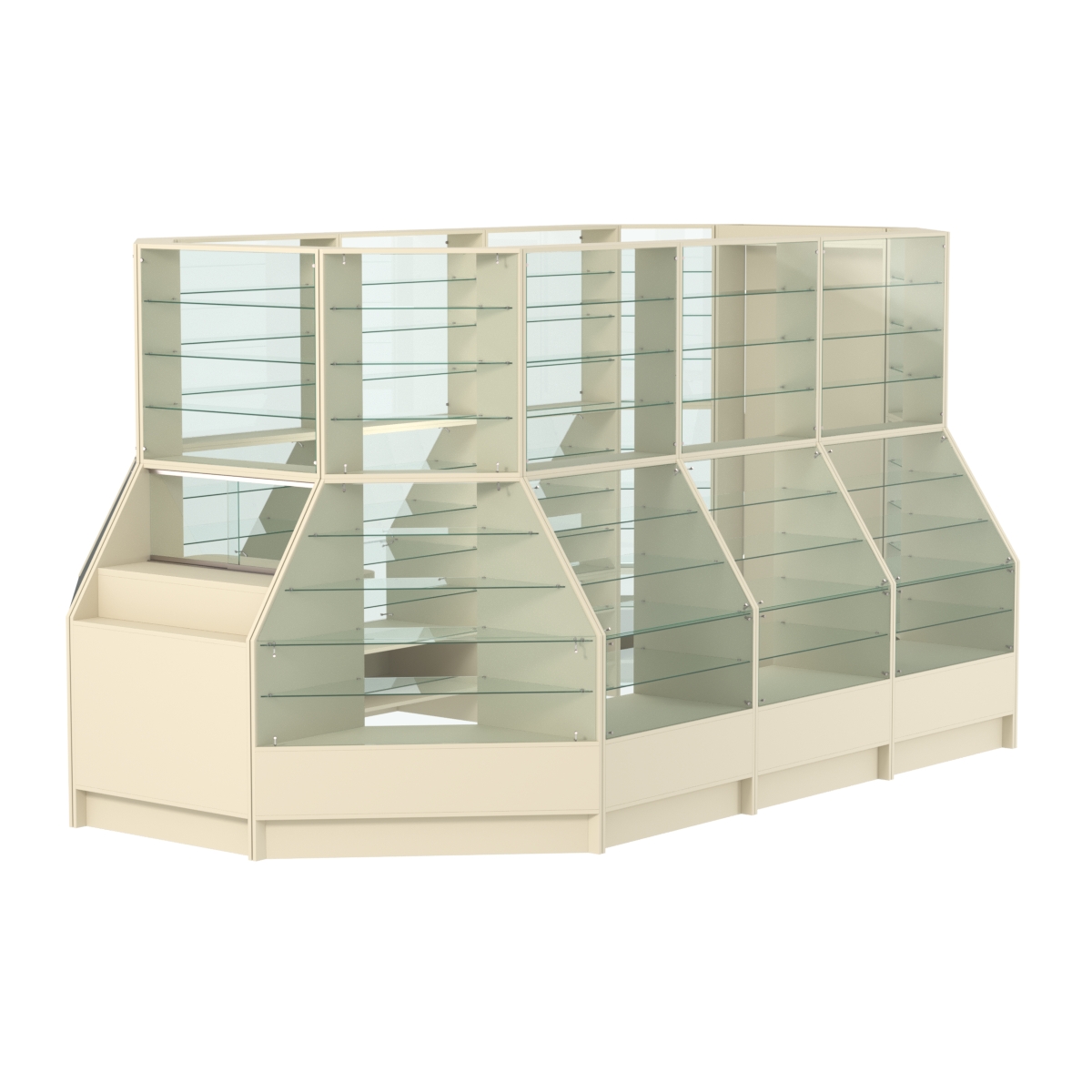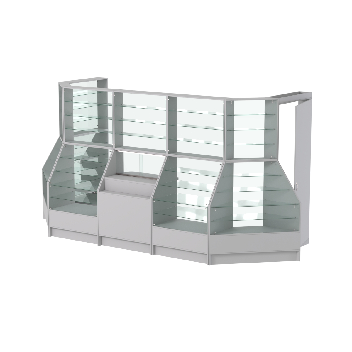 Прилавки, павильоны и витрины серии Алмаз делаются только из качественных материалов, например, ламинированного ДСП размером 16 мм. Продуманные до мельчайших деталей, конструкции на вашей площадке выглядят интересно и привлекательно для будущих покупателей, а уникальность серии придают многочисленные грани, которые помогут создать в магазине неповторимое индивидуальное очарование. При изготовлении прилавков Алмаз, в работе использовались 4 стеклянные полки на металлических полкодержателях, а при изготовлении витрин - 7 полок. Интересный изогнутый вид линий торговых секций, используемых в конструкциях этого типа, предоставляют возможность покупателю по максимуму рассмотреть выложенный товар на прилавках. Боковины выполнены из прочного ДСП, которые служат своеобразным щитом делая конструкции устойчивыми.