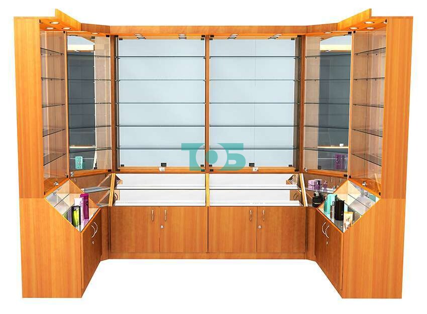- Витрины оборудованы верхним фризом с подсветкой, зеркальной задней стенкой, запирающимися на ключ дверцами.