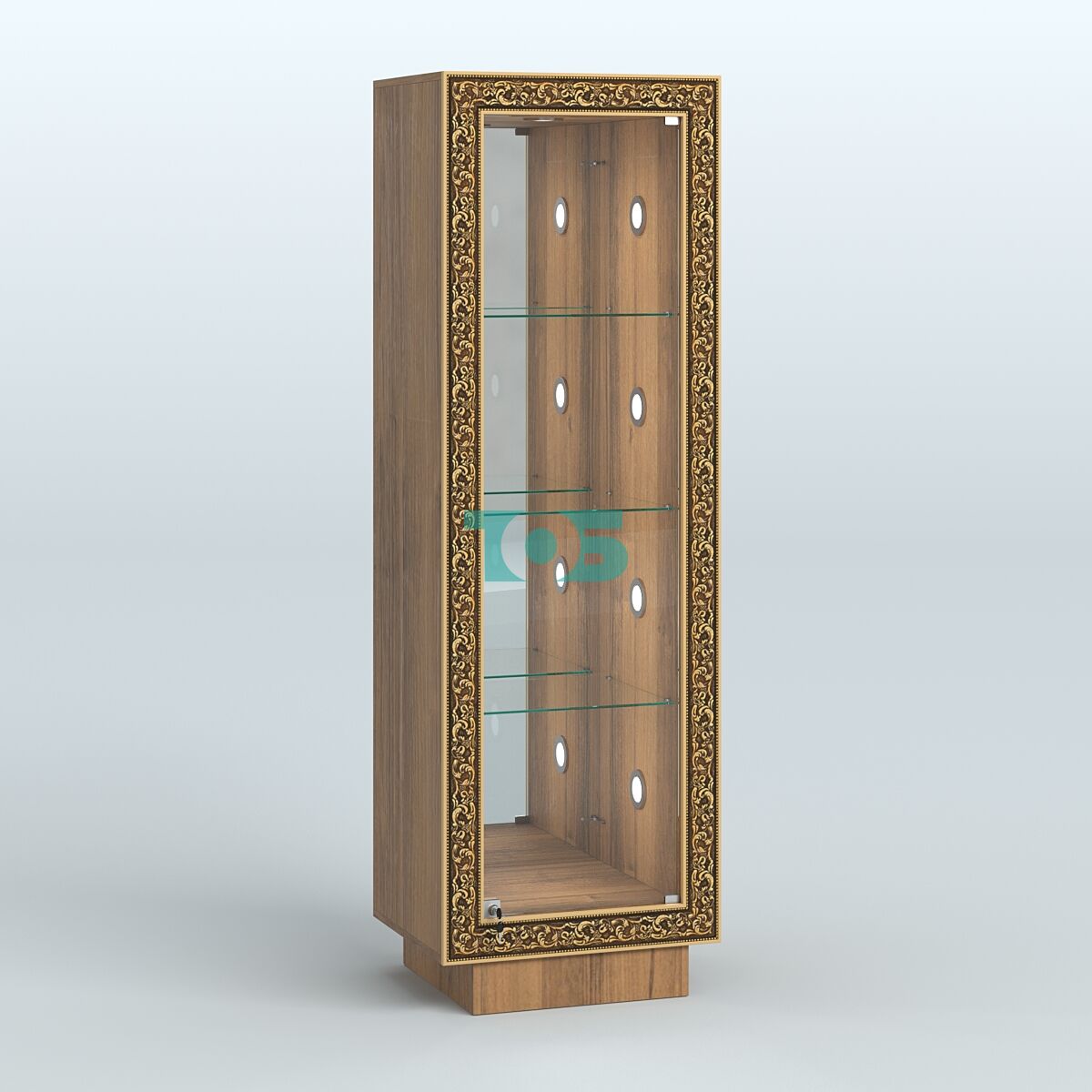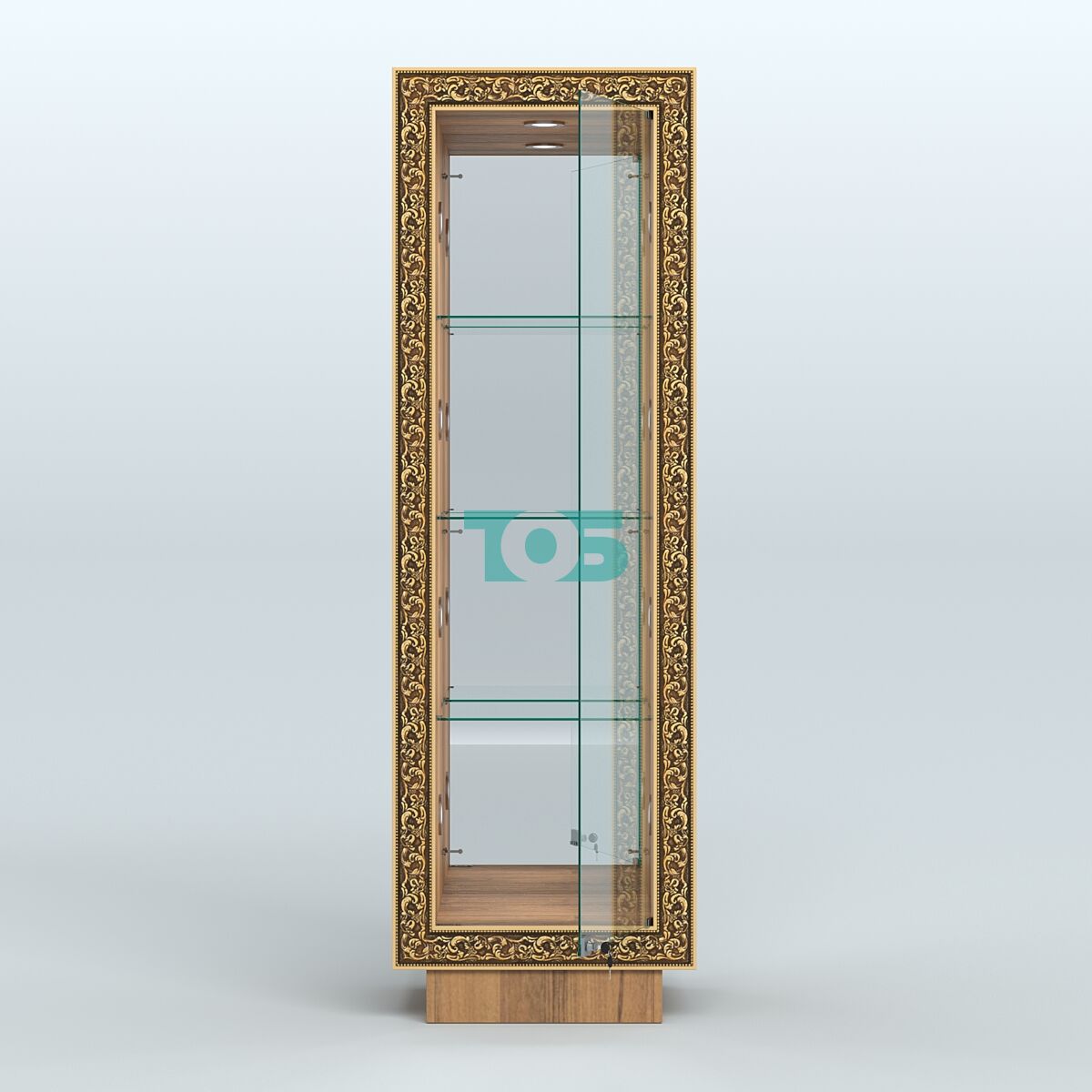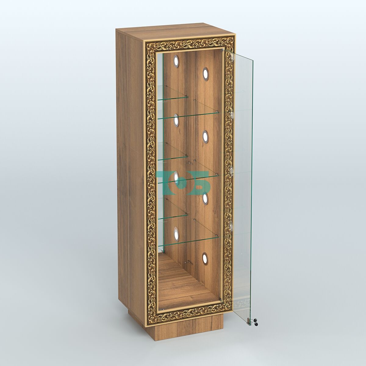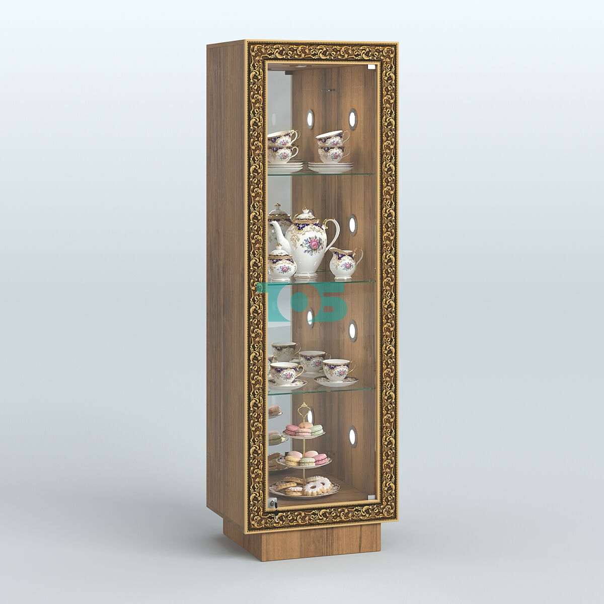 Фасадная часть: декорирована цветными молдингами под золото, которые подчёркивают чёткость линий и помогают вписать витрину в интерьер любого стиля.