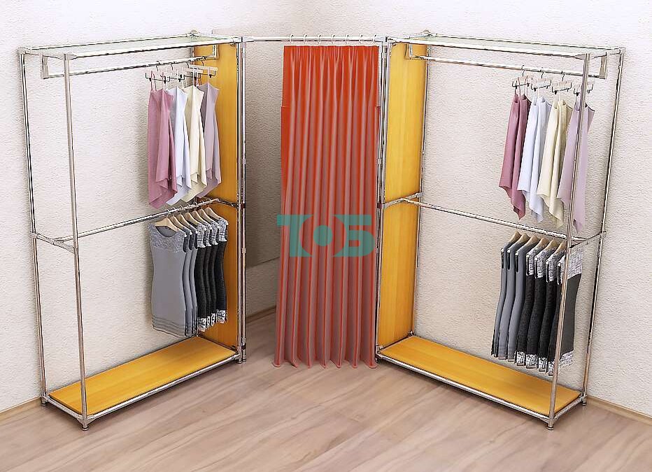 - правый и левый блок с продольными поручнями для одежды образуют угловое пространство для примерочной;