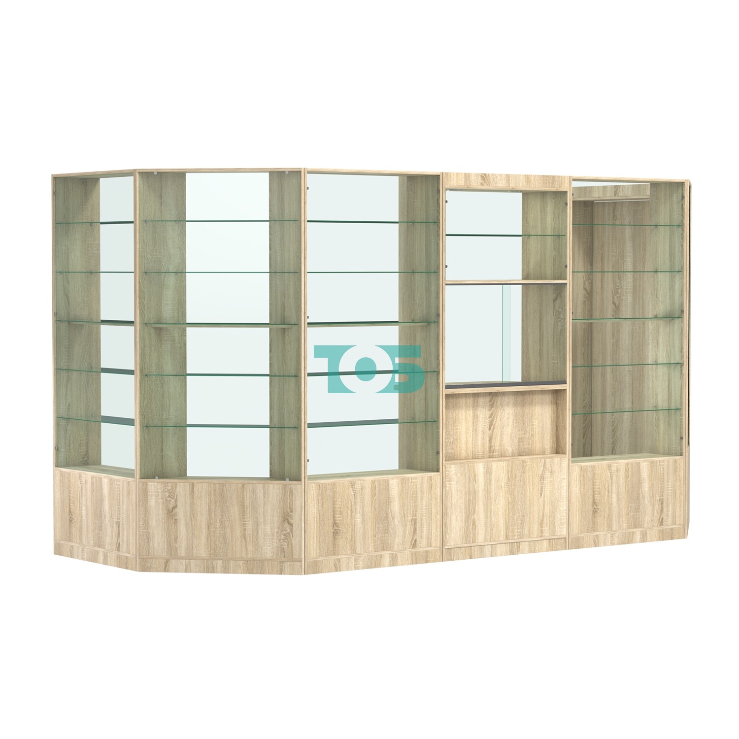 В павильоне предусмотрено по пять стеклянных полок, которые могут использоваться для размещения товаров или декоративных элементов.