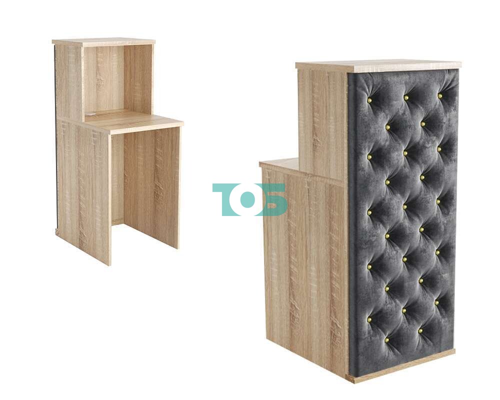 Фронтальная часть ресепшена декорирована обивкой из серого велюра под бархат, что придает изделию роскошный и изысканный вид.