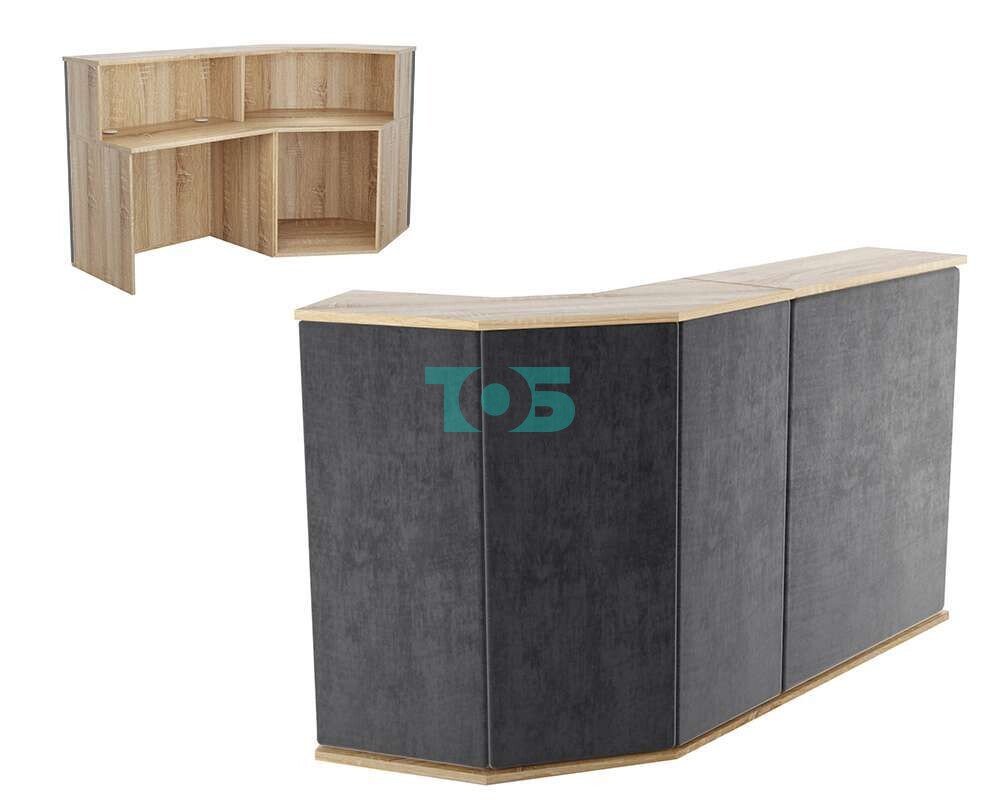 Фронтальная часть ресепшена декорирована обивкой из серого велюра, имитирующего бархат, что придает ему роскошный и изысканный вид.
