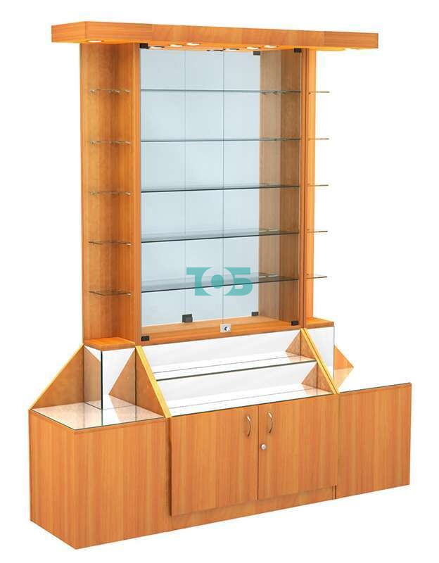 - По 5 стеклянных полок в верхнем блоке витрины, также две полки в нижней части в виде ступеней.