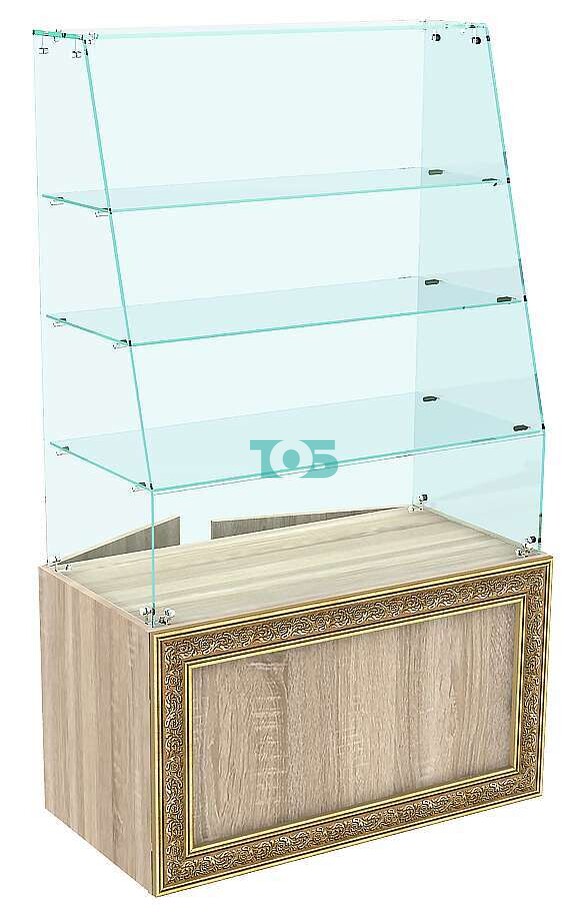 Отличия модели стеклянного торгового прилавка с наклонным стеклом и декором серии БАРОККО №БА-ПИ-15: