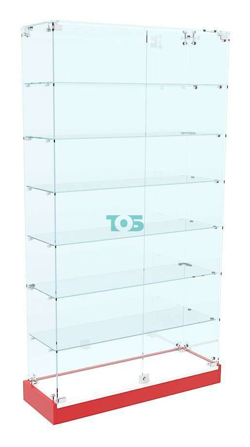 Отличия модели стеклянной витрины узкой прозрачной в центр зала для аптеки RED-ХП-09: