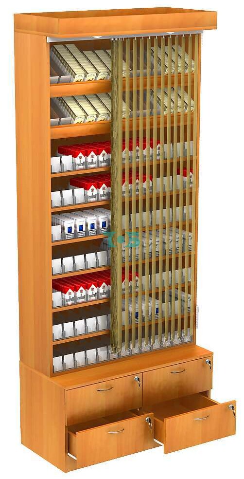 Стеллаж для сигарет с акриловыми диспенсерами T-19 изготавливается из ламинированного ДСП толщиной 16 мм.