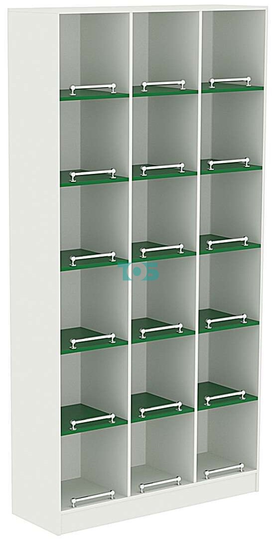 Отличия модели стеллажа с 18 ячейками и хром ограничителями для аптеки ИЗУМРУД-ЯЧ-06: