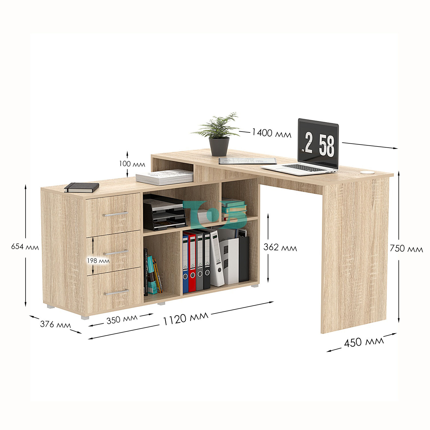 • Г-образная форма стола: отлично вписывается в угловое пространство, позволяя эффективно использовать площадь и обеспечивать удобный доступ ко всем зонам рабочего места.
