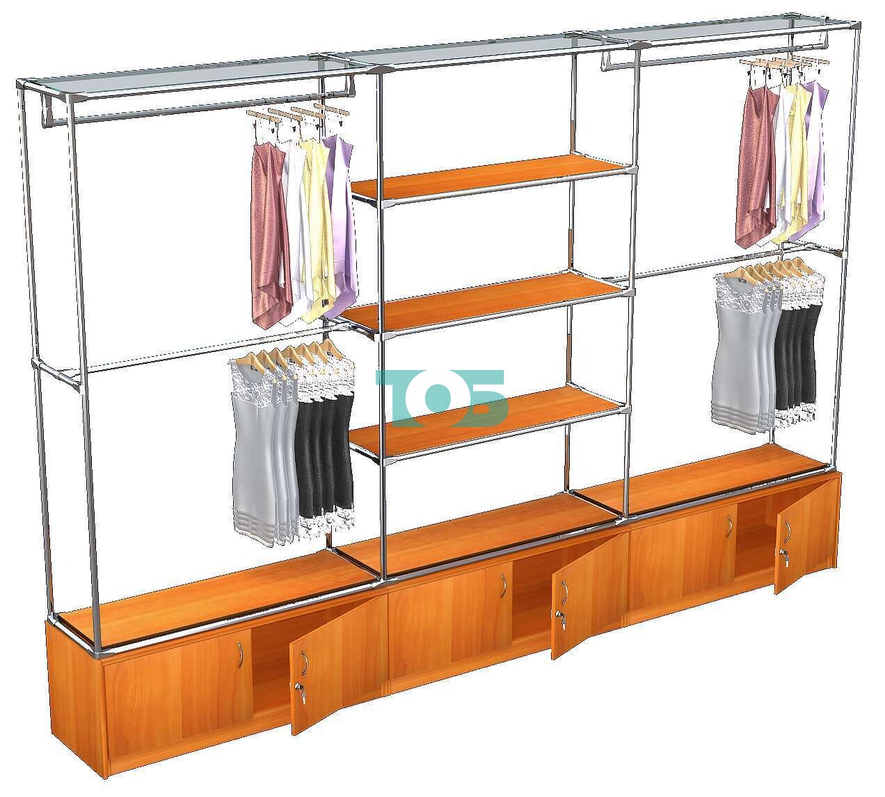 Отличия модели торговой системы ХРОМ без ДСП 3600 мм с тумбами Т21, полками ДСП и поручнями №2: