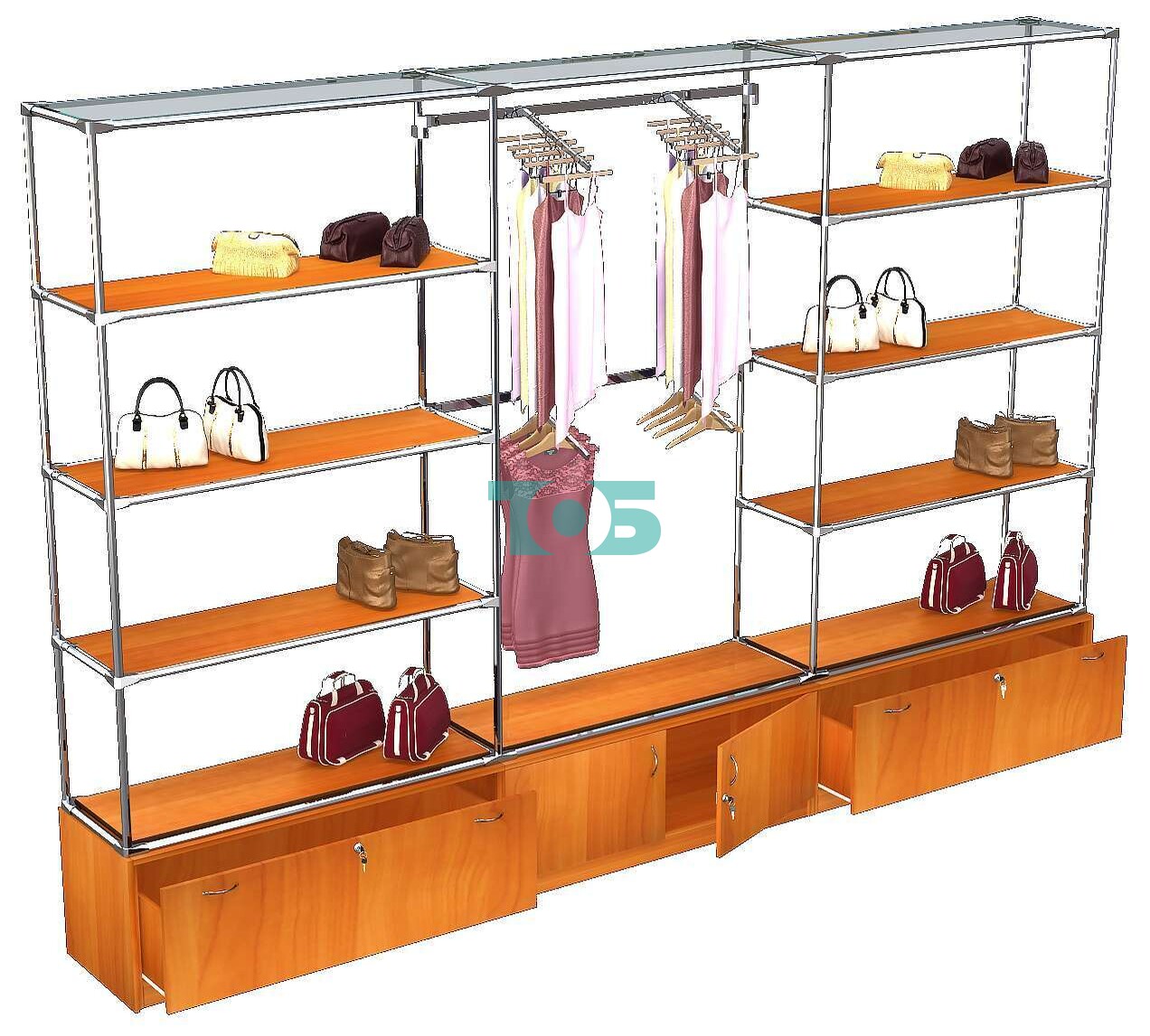 Отличия модели торговой системы ХРОМ без ДСП 3600 мм с тумбами Т11, Т21, полками ДСП и поручнями №4: