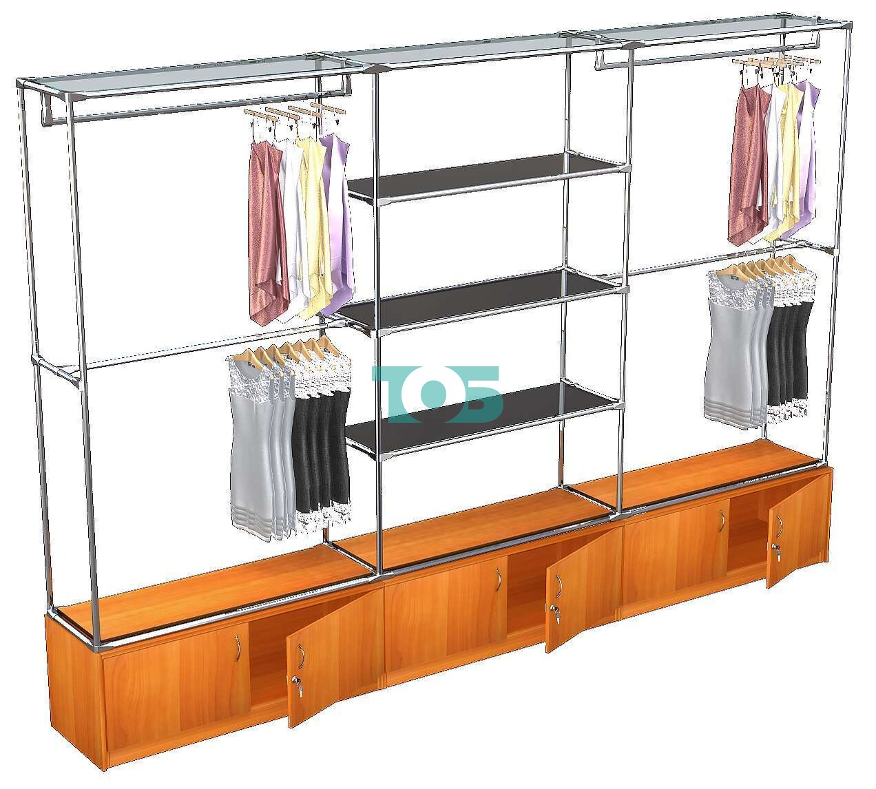 Отличия модели торговой системы ХРОМ без ДСП 3600 мм с тумбами Т21, тонированными полками и поручнями №2: